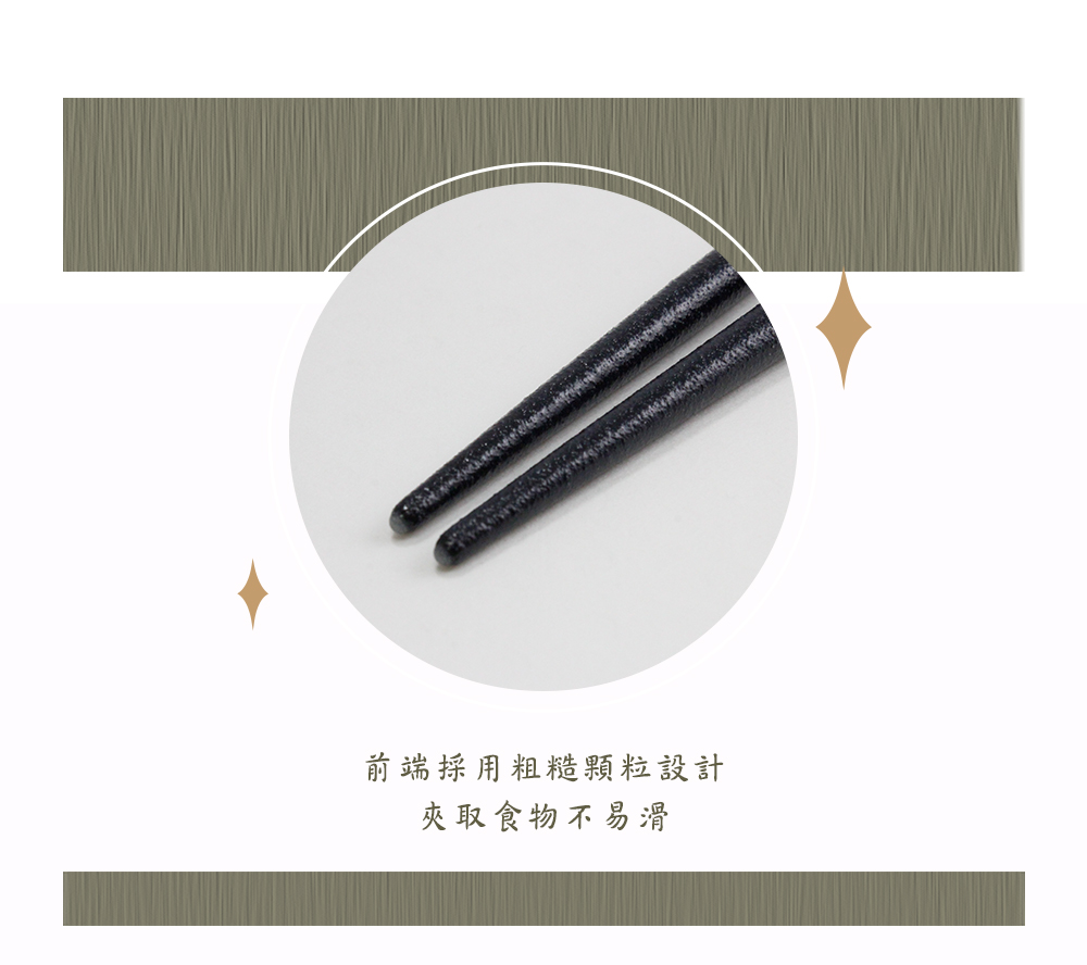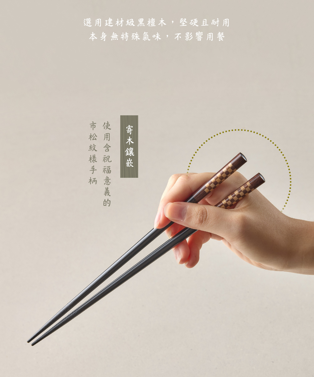 選用建材級黑檀木,堅硬又耐用,因為本身沒有特殊氣味,不影響用餐,前端採用粗糙顆粒設計,夾取不易滑。