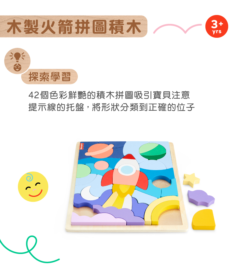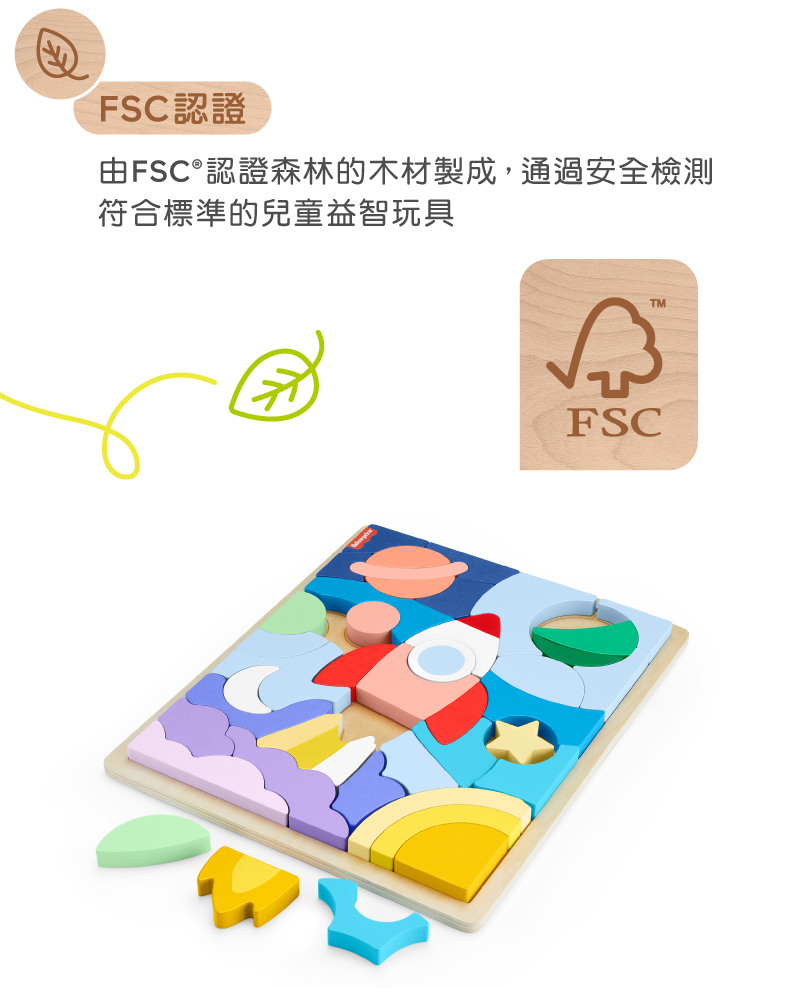 ■ 商品說明:1. ""費雪木製火箭拼圖積木""包括42個不同形狀的積木,透過堆疊、分類和拼搭超凡脫俗的太空設計。2. 除了可以把繽紛的積木堆疊或分類放到托盤中,托盤上也提供了幫助嬰幼兒創建火箭飛船的提示線。3. 透過拼圖遊戲,讓嬰幼兒動腦,挑戰解決問題的能力。4. 可以訓練的手眼協調及注意力。5. 由FSC® 認證森林的木材製成。(FSC C130462, 2022)並通過安全檢測,為符合標準的兒童益智玩具。