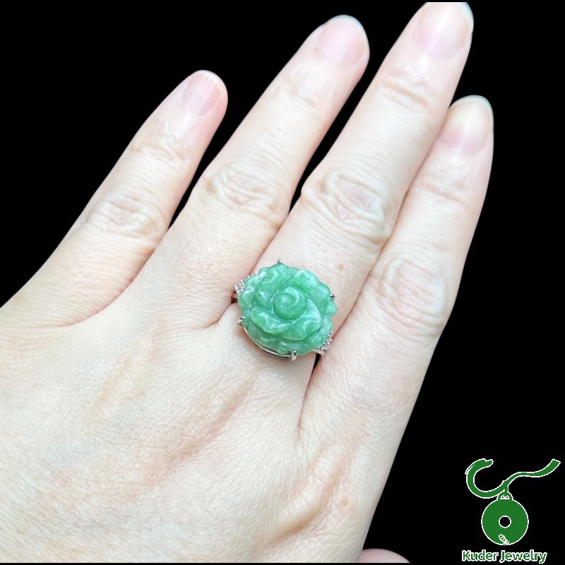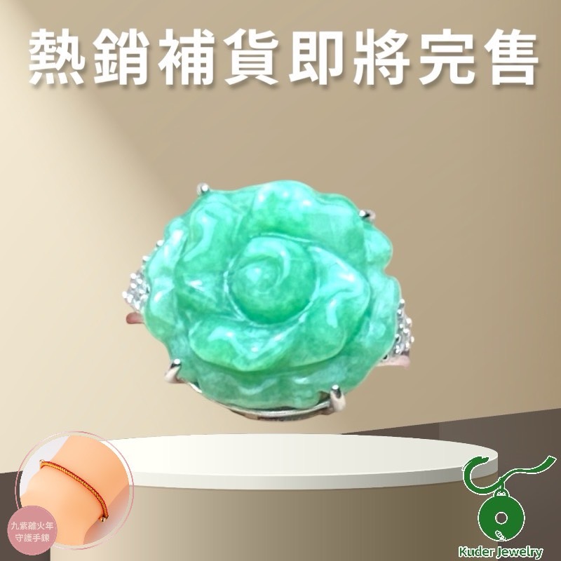 [快速出貨]【Kuder Jewelry】天然A貨冰綠翡翠玫瑰戒贈本命年守護手鍊一條附珠寶鑑定書