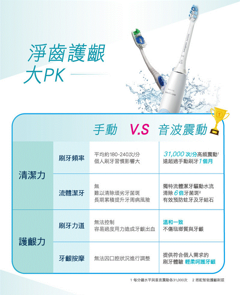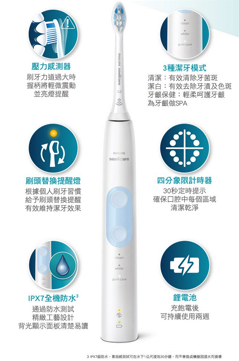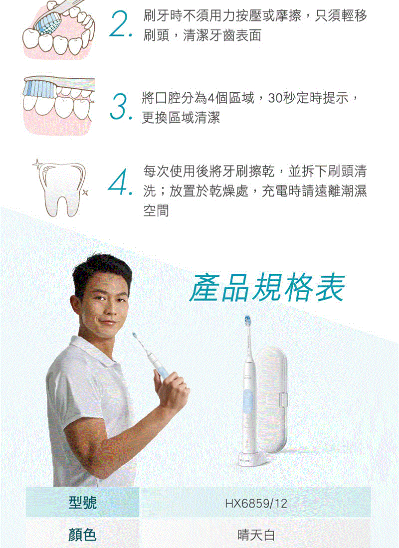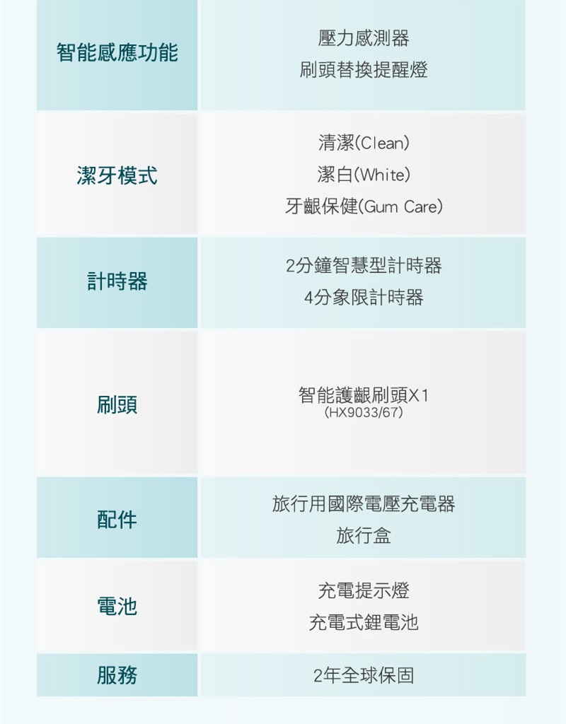 商品規格 品牌 PHILIPS飛利浦 型號 HX6859 產地 中國 類型 超音波振動式 尺寸(長x寬x高)(mm) 含彩盒尺寸約650*173*237mm 電源類型 充電式 電源 100~240V 重量(g) 含彩盒尺寸約580g 潔牙模式 清潔 , 潔白 , 護齦 刷頭數量 x1 國際電壓 有國際電壓 其它配件 旅行盒 適用對象 成人 保固年限 2年 個人衛生用品 個人衛生用品