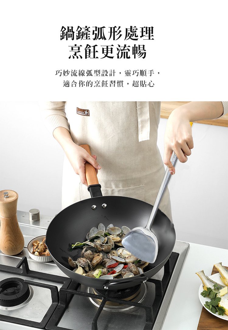 ●手把流線型設計完美契合人體工學&貼合手型,手把鉚釘加固,安全隔熱防燙,不怕燙到手煎炒燉煮、料理一次到味,出鍋盛菜更容易