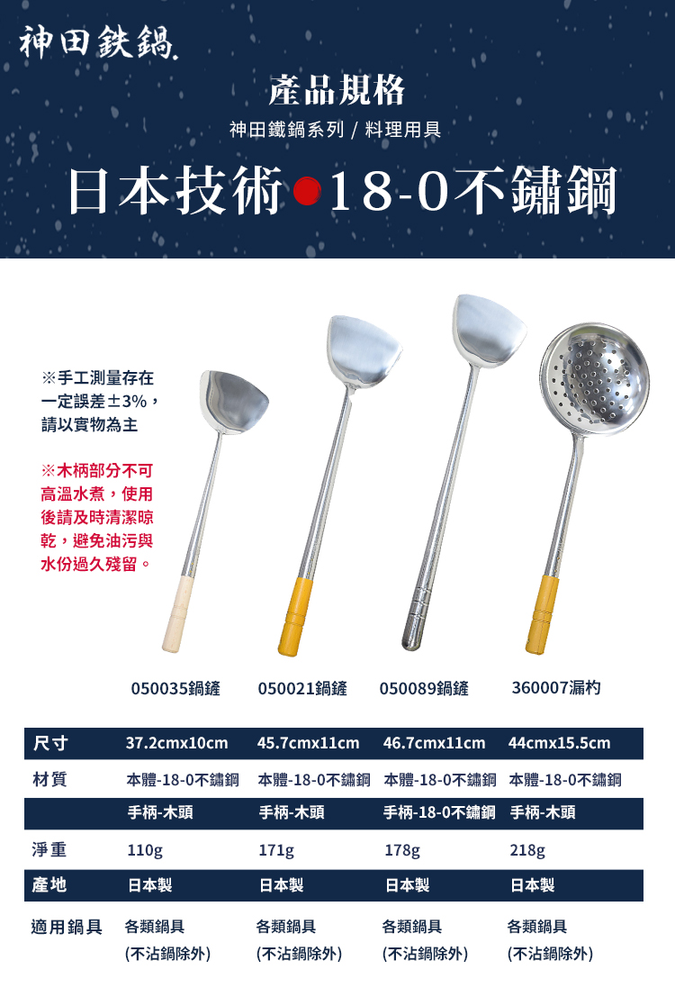 神田-050021不鏽鋼鏟(木柄)-尺寸:全長45.7cm(含手柄)x寬11cm、手柄-36.5cm(手量誤差±3%)-材質:本體-加厚18-0不鏽鋼(430)/手柄-木頭-淨重約:171g(手量誤差±5%)-適用鍋具:各類鍋具均適用(除不沾鍋之外)-產地:日本製 Made in Japan※木柄部分不可高溫水煮,使用後請及時清潔晾乾,避免油污與水份過久殘留。