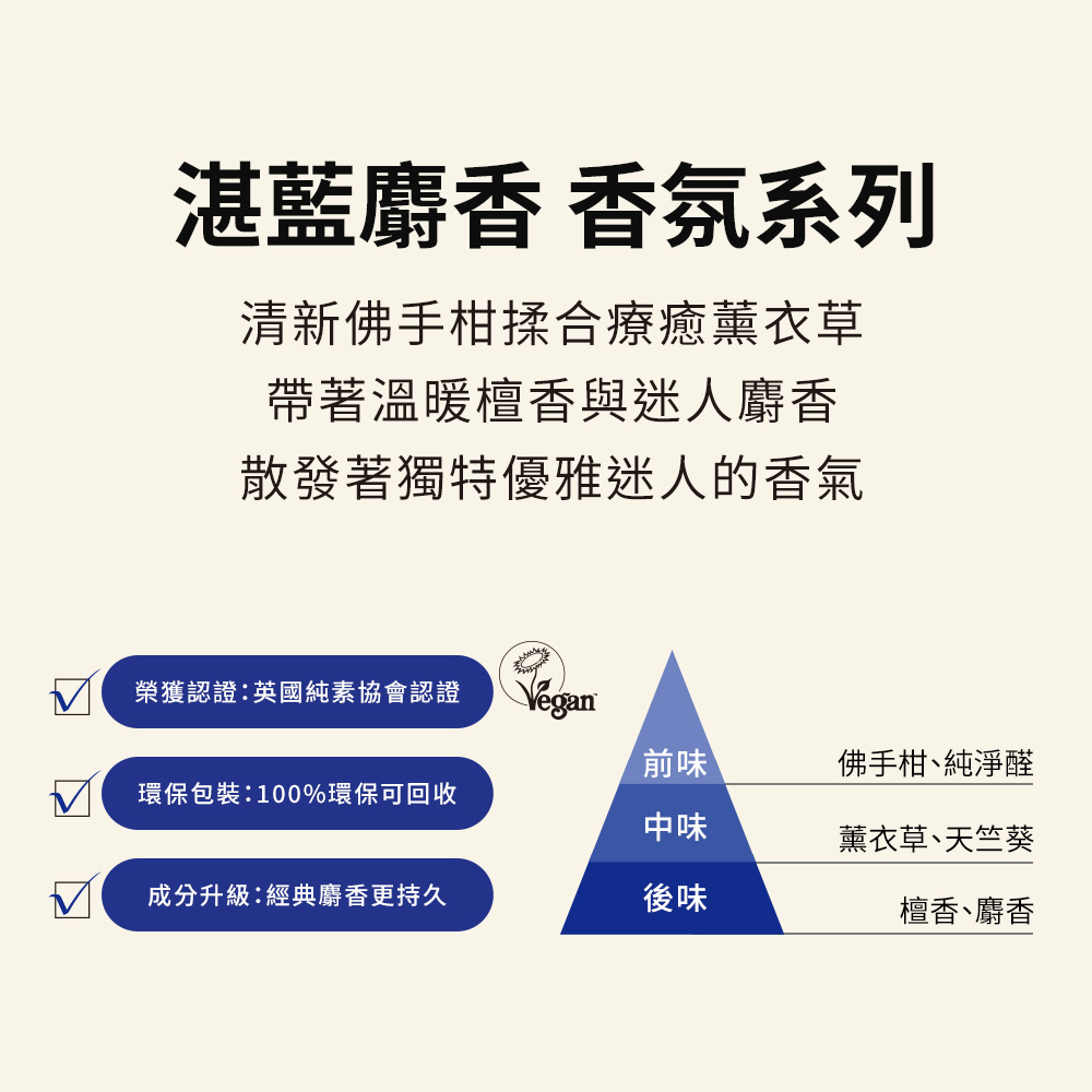 100%全素香氛,蘊含甘油,可於沐浴時溫和清潔全身肌膚、同時潤澤柔嫩美肌。洗後肌膚倍感細緻光滑不乾澀,全身散發如絲柔般細膩優雅的浪漫麝香。