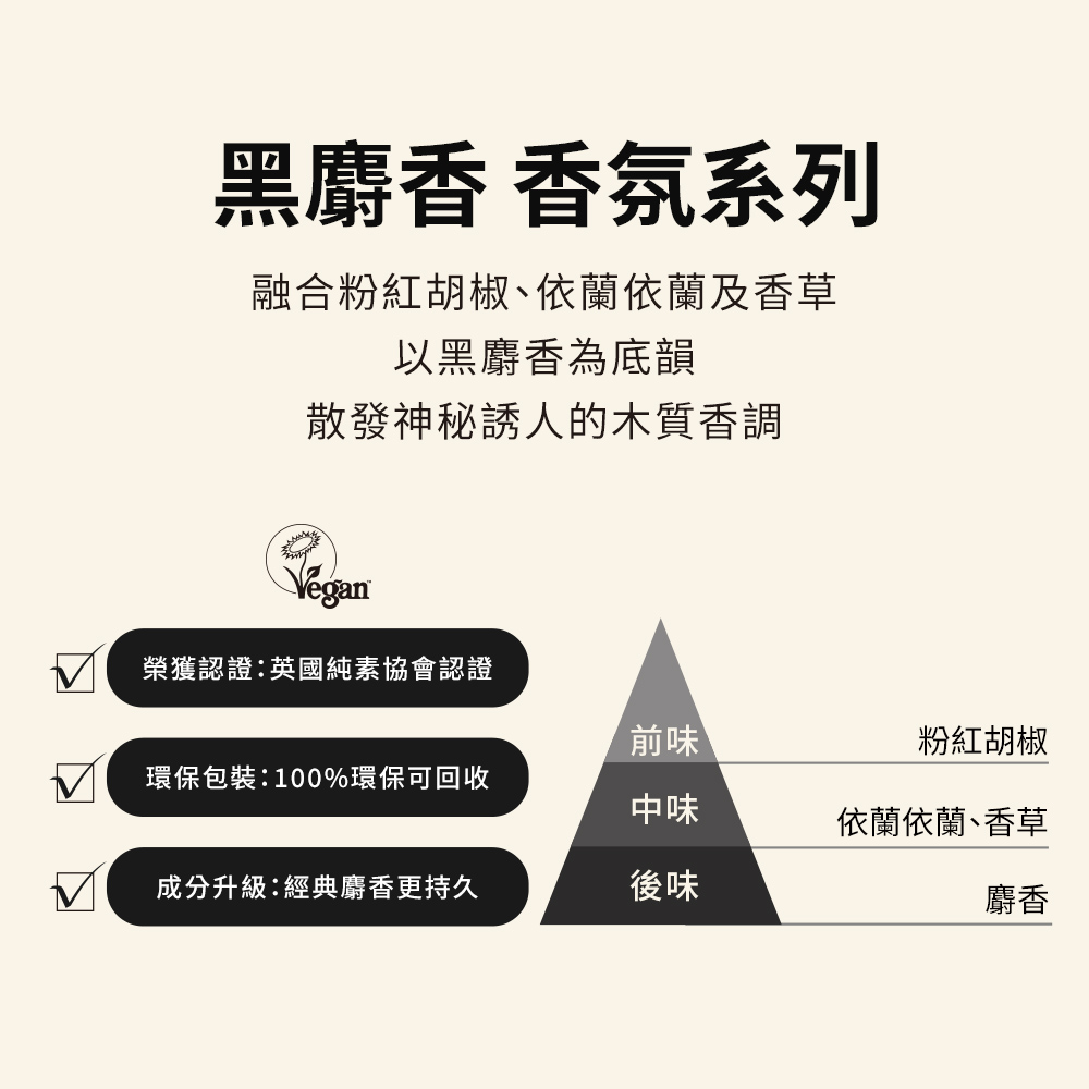 100%全素香氛,蘊含甘油,可於沐浴時溫和清潔全身肌膚、同時潤澤柔嫩美肌。洗後肌膚倍感細緻光滑不乾澀,全身散發神秘誘人的木質香調。