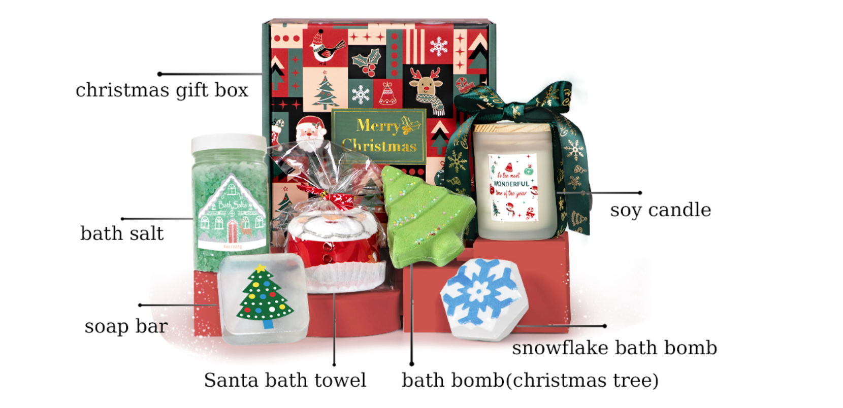 關於聖誕節 - 禮物包中的每件商品都有強烈的聖誕節氣氛。 聖誕樹和雪花圖案肥皂、聖誕老人和禮盒圖案沐浴炸彈、蘋果肉桂香味蠟燭和優質聖誕主題盒,使其成為完美的聖誕禮物。