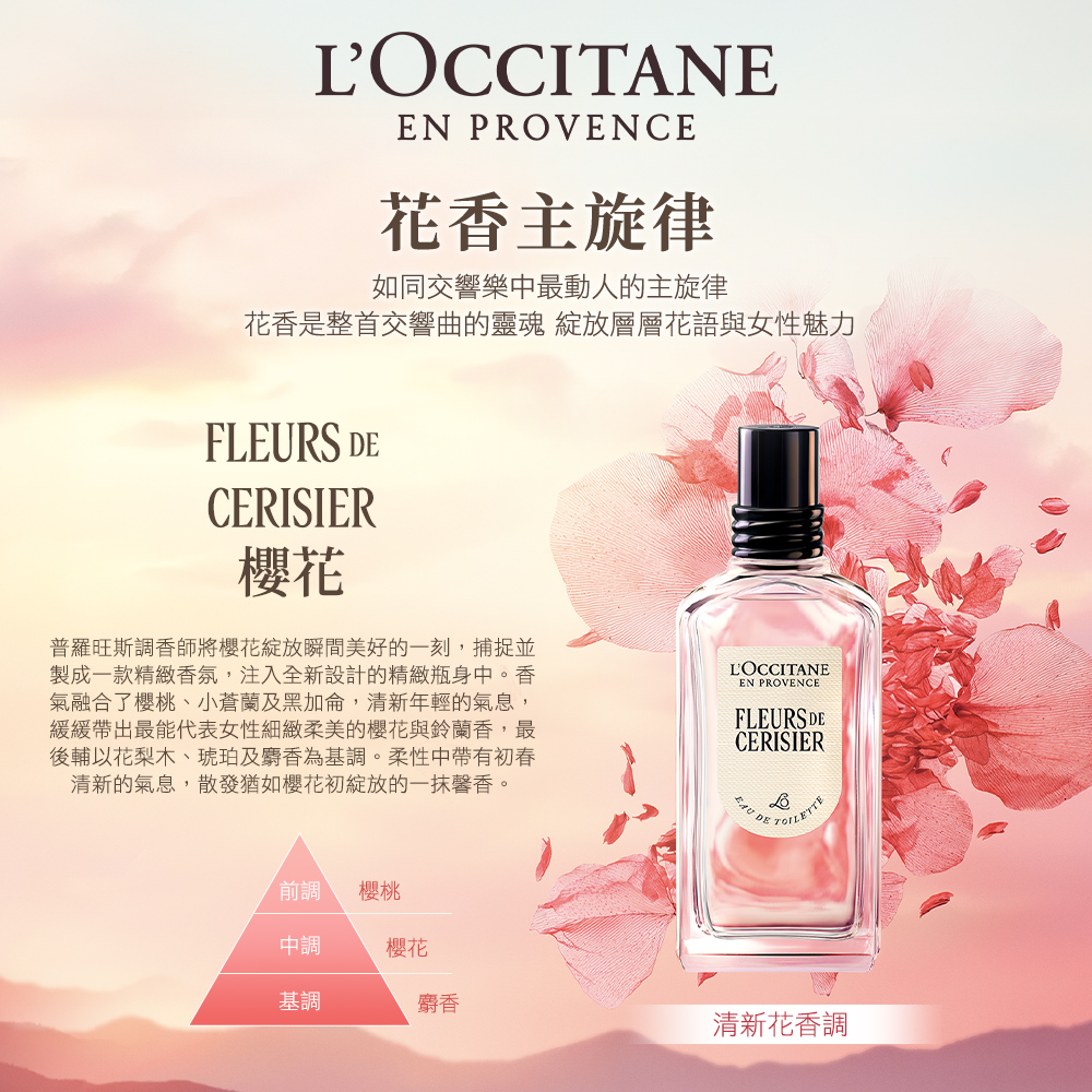 最後輔以花梨木、琥珀及麝香為基調。 柔性中帶有初春清新的氣息,散發猶如櫻花初綻放的一抹馨香。