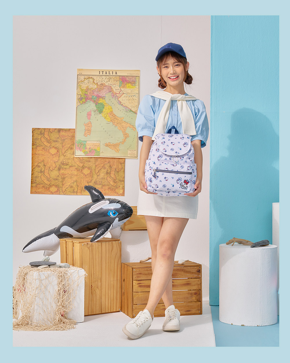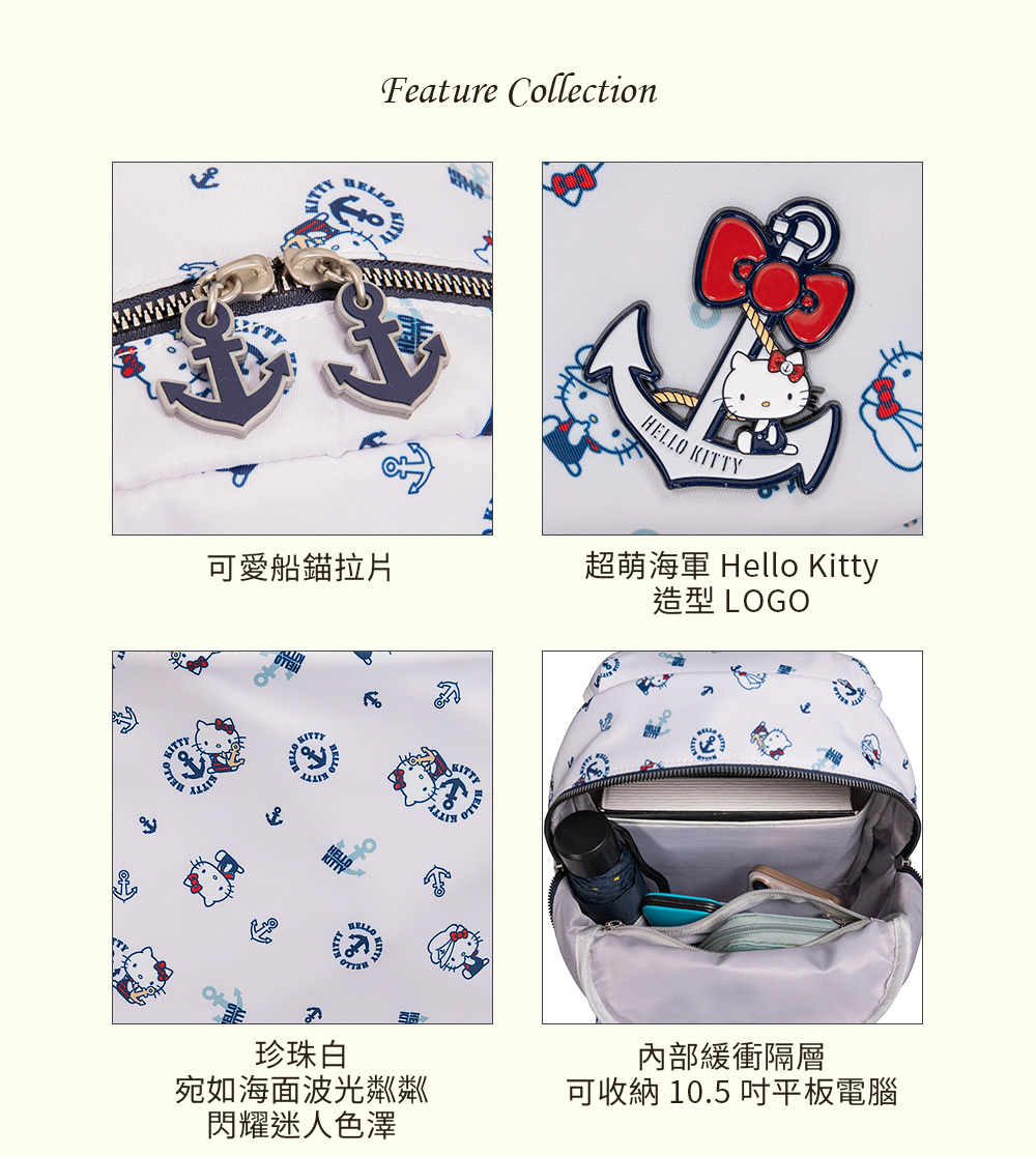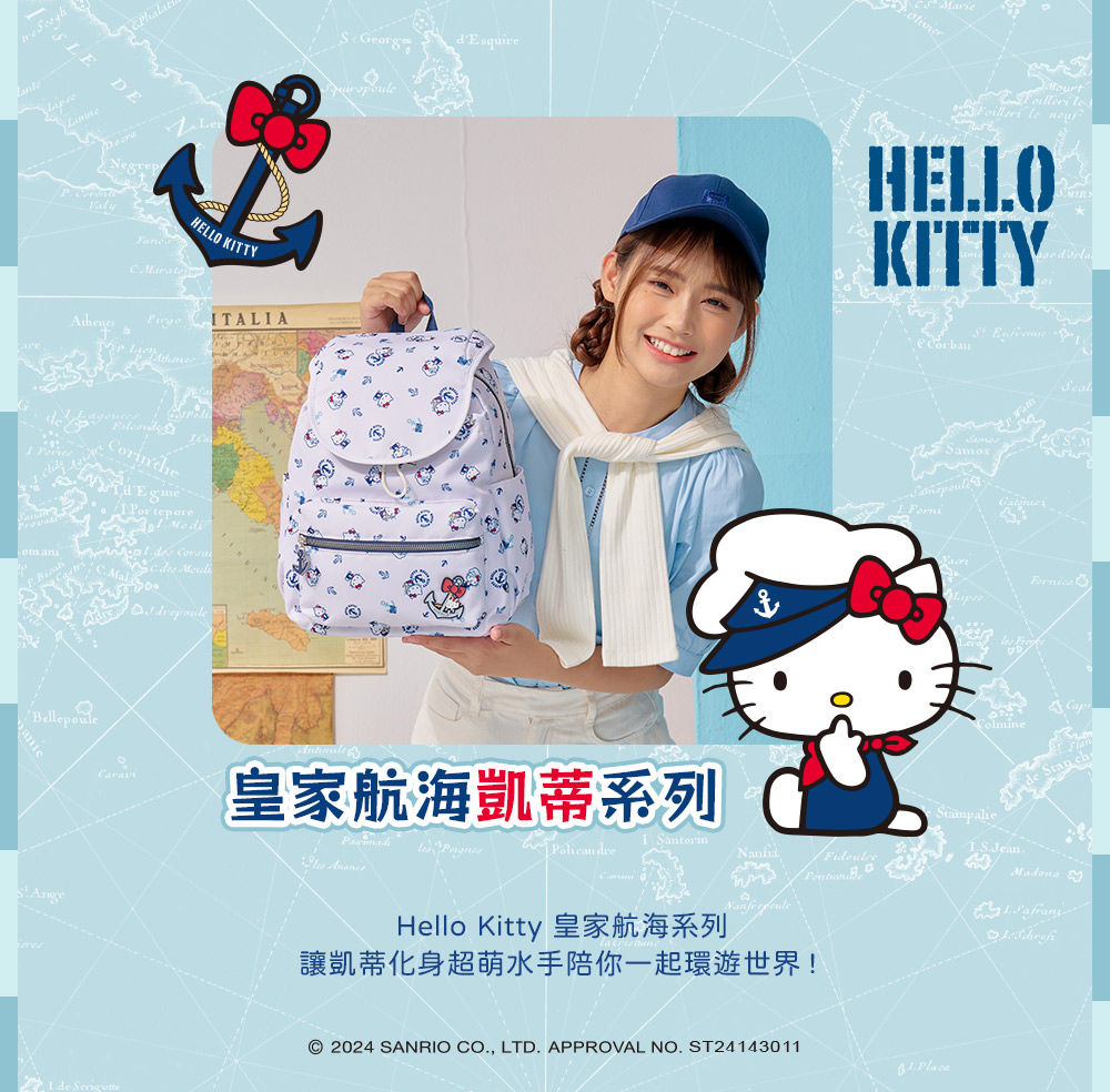 Hello Kitty 皇家航海系列,凱蒂化身超萌水手陪你一起環遊世界! 以經典海洋藍|優雅珍珠白結合海軍元素,打造各式休閒包款及旅遊配件,讓每一次出行都充滿活力!
