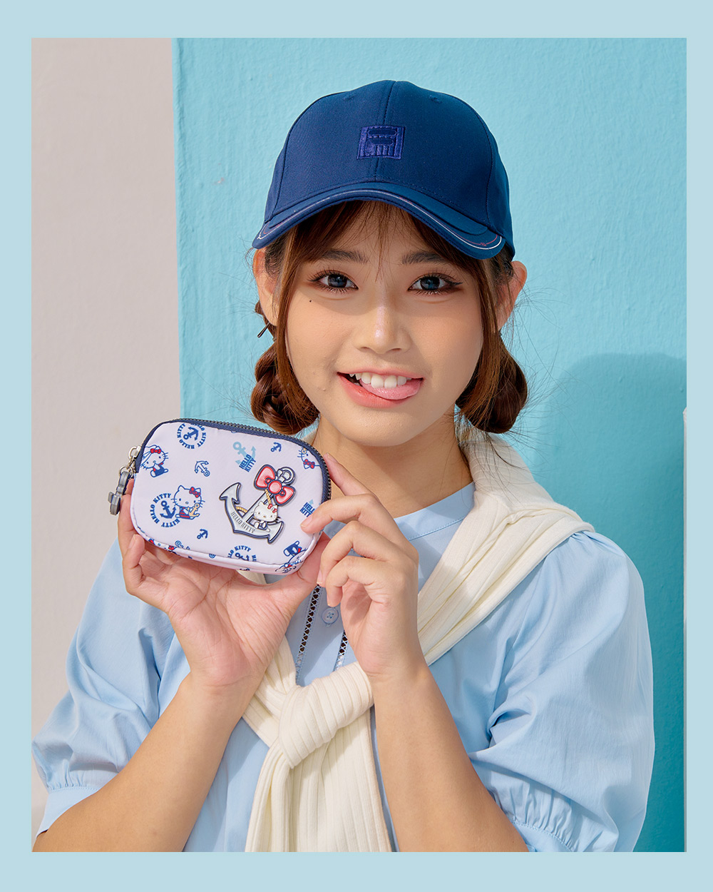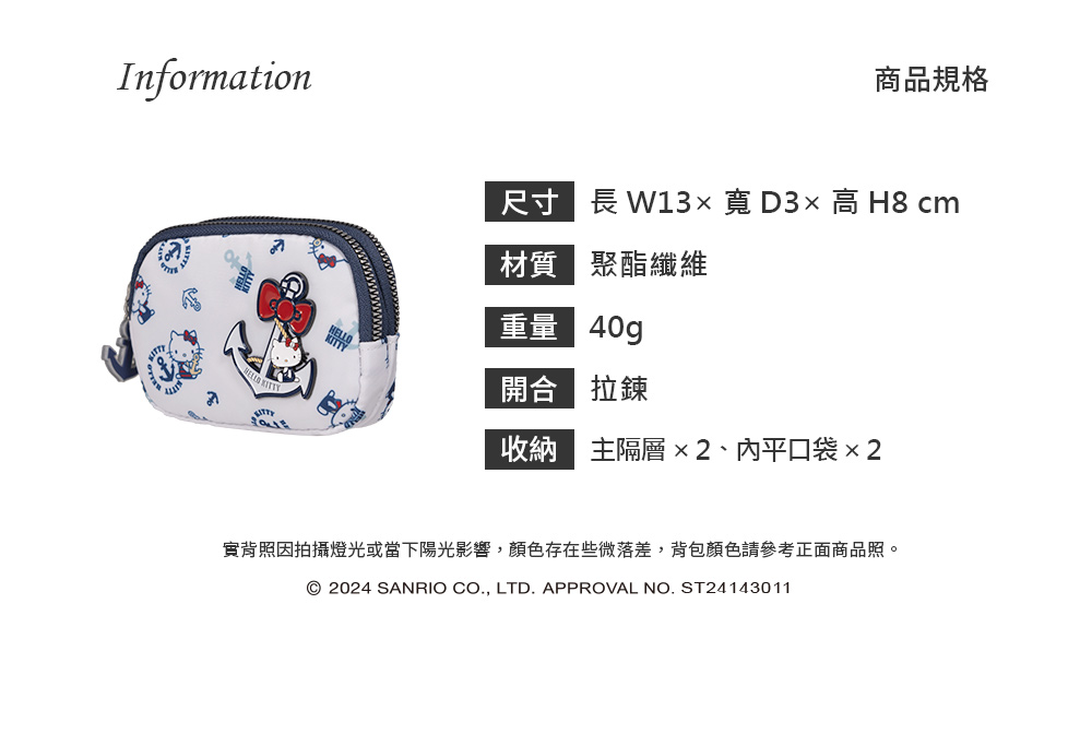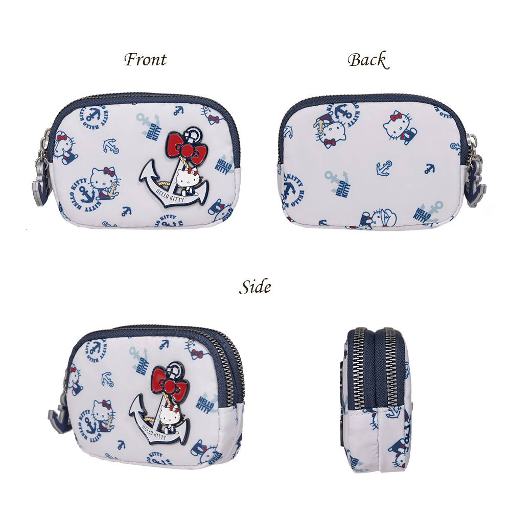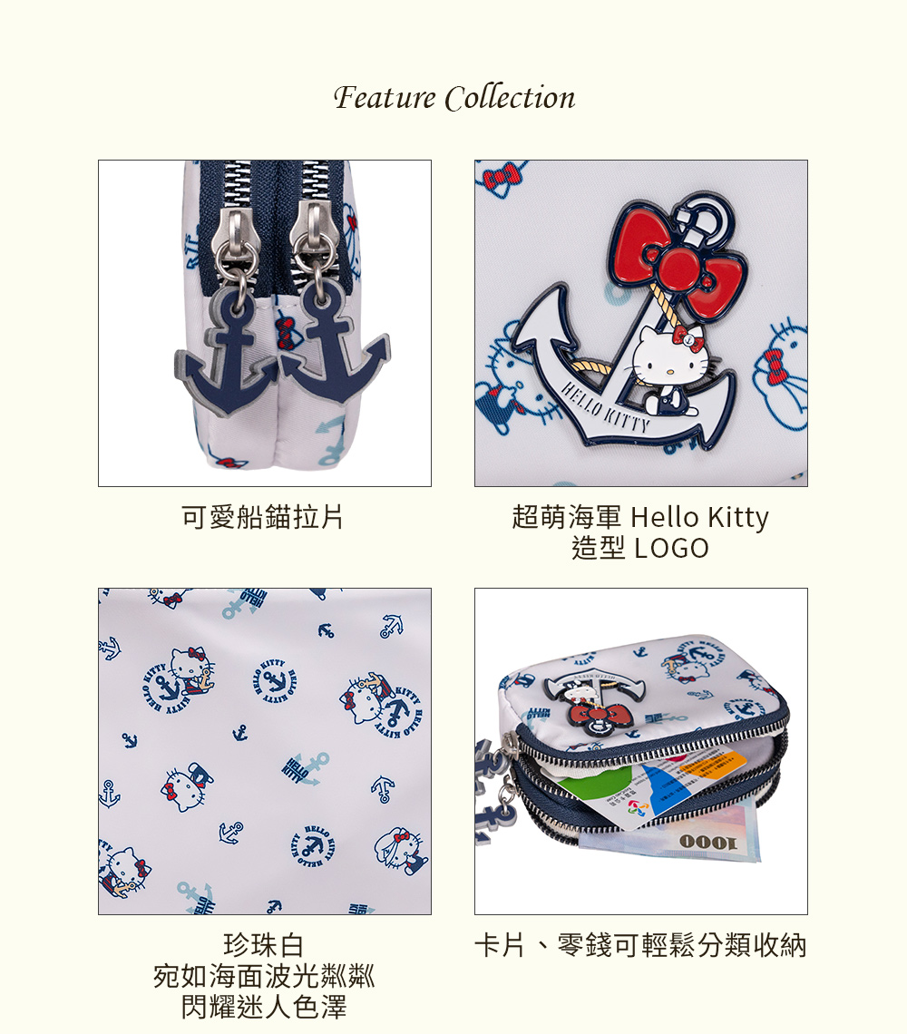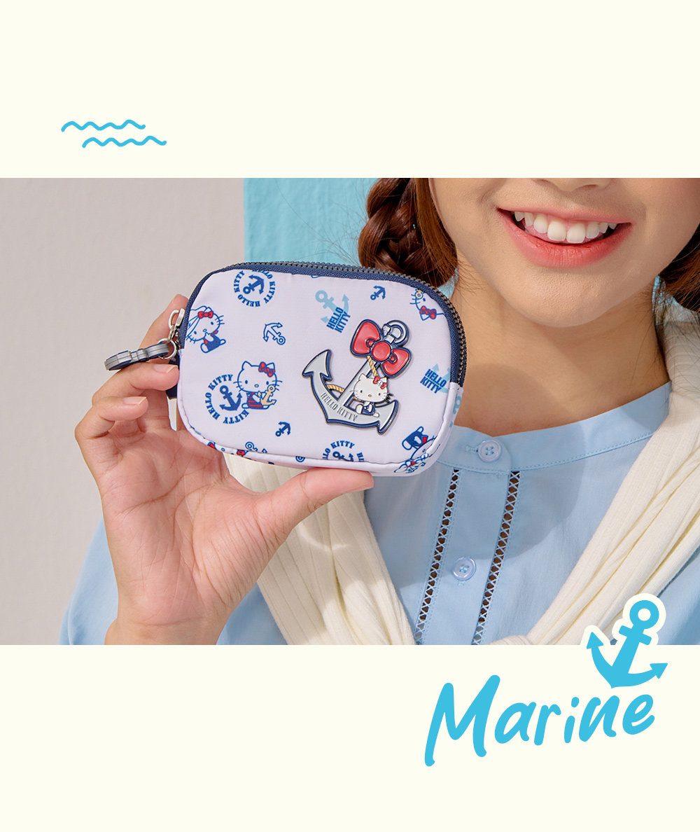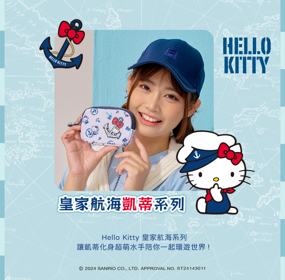 Hello Kitty 皇家航海系列,凱蒂化身超萌水手陪你一起環遊世界! 以經典海洋藍|優雅珍珠白結合海軍元素,打造各式休閒包款及旅遊配件,讓每一次出行都充滿活力!