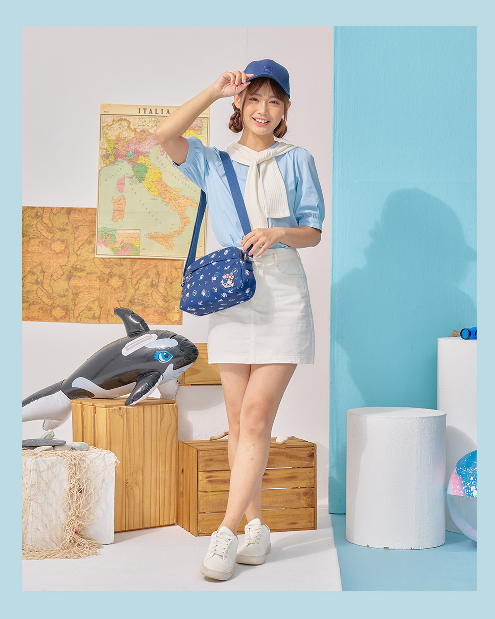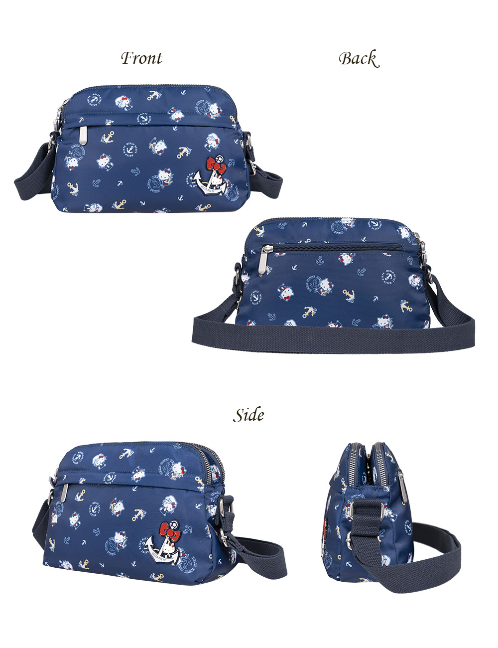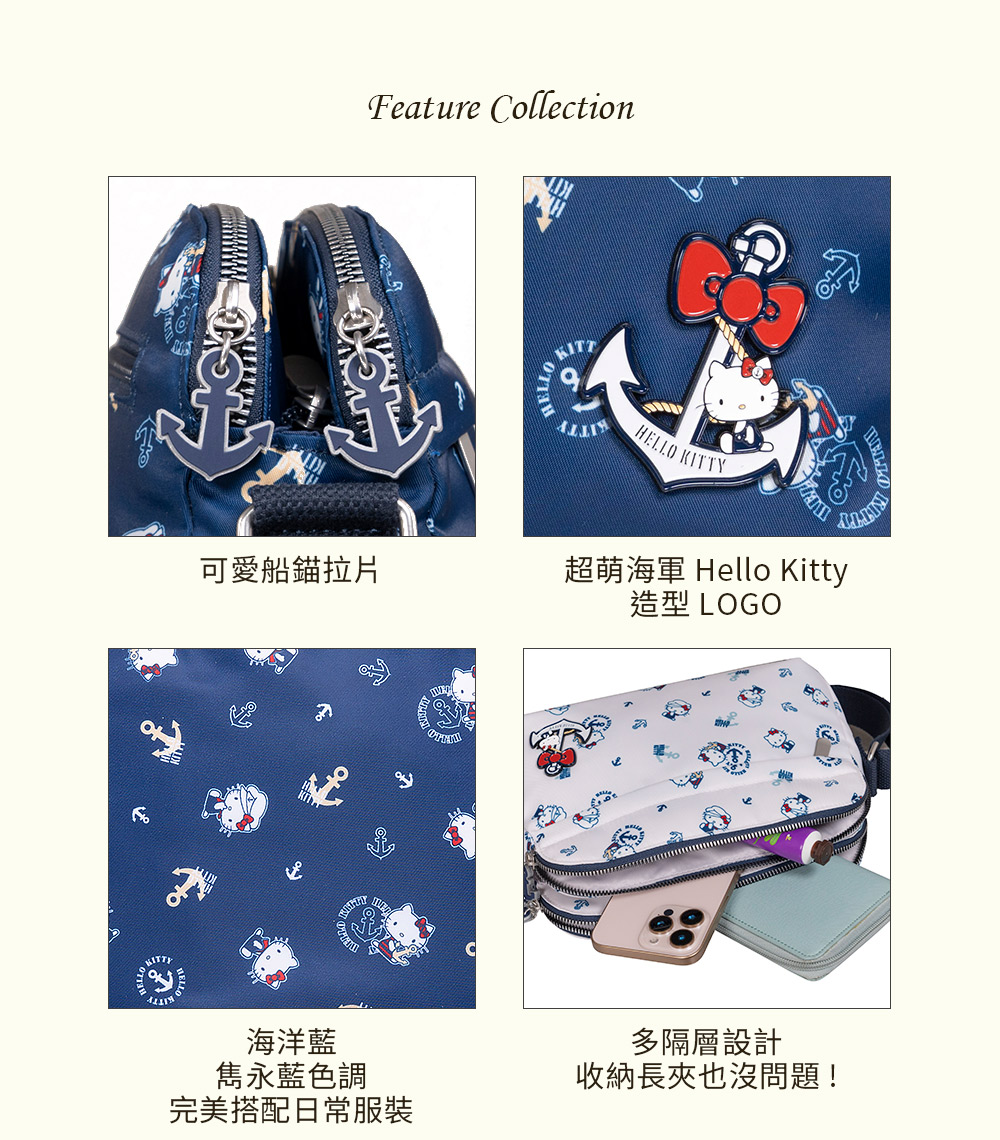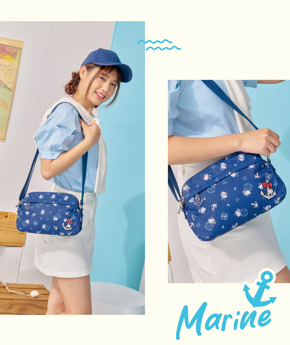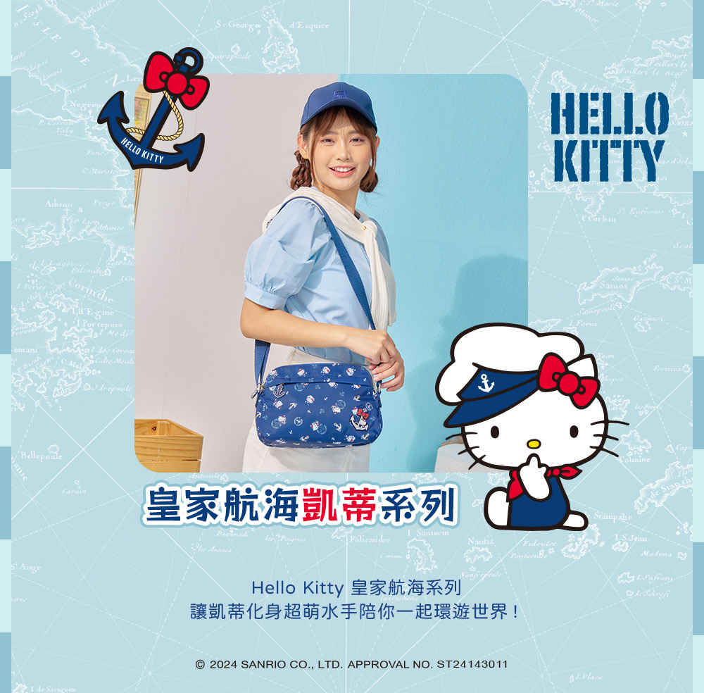 Hello Kitty 皇家航海系列,凱蒂化身超萌水手陪你一起環遊世界! 以經典海洋藍|優雅珍珠白結合海軍元素,打造各式休閒包款及旅遊配件,讓每一次出行都充滿活力!