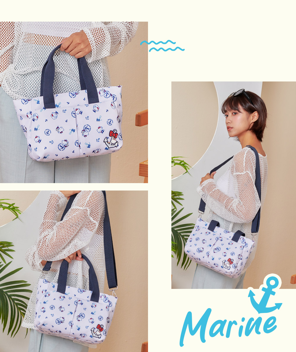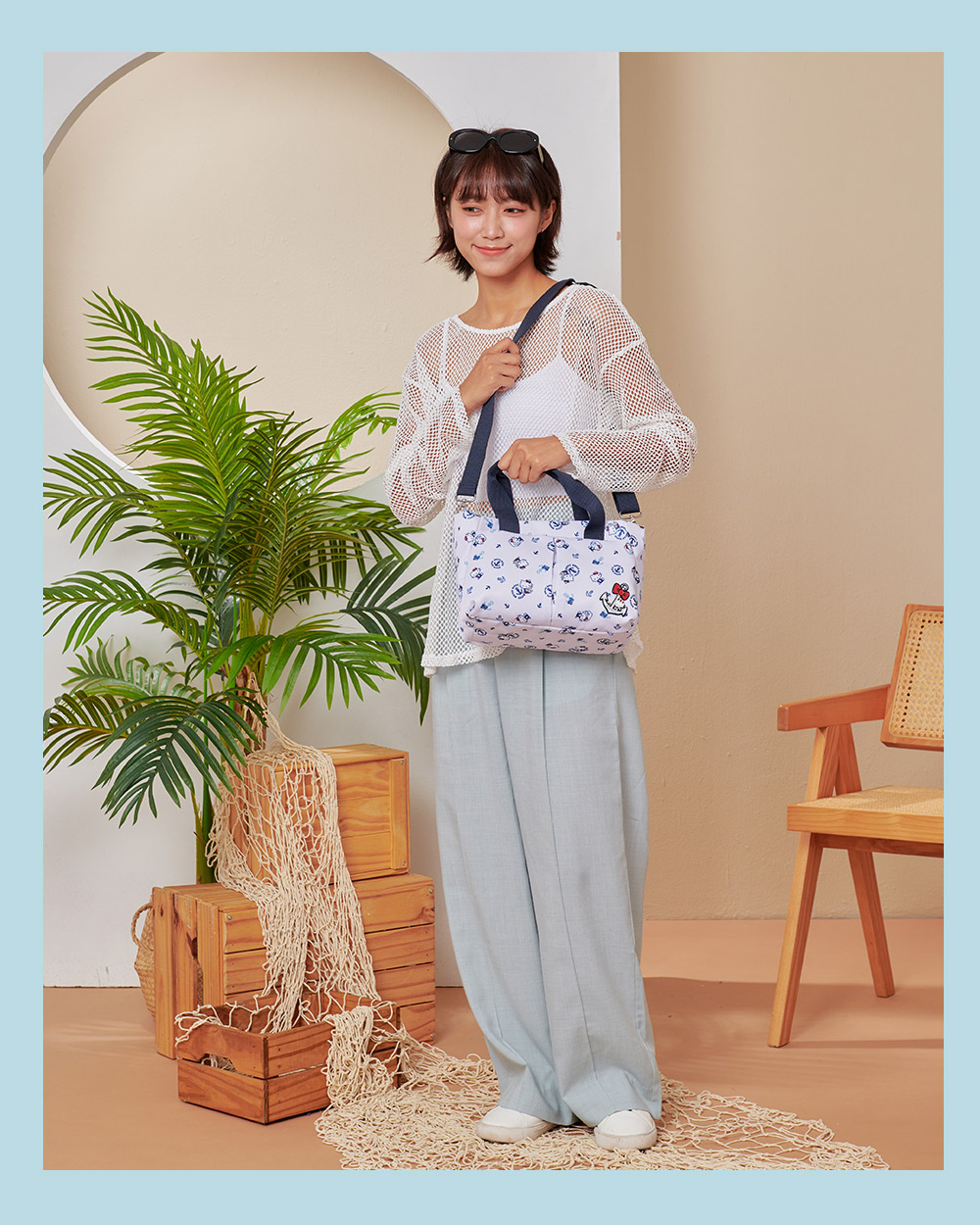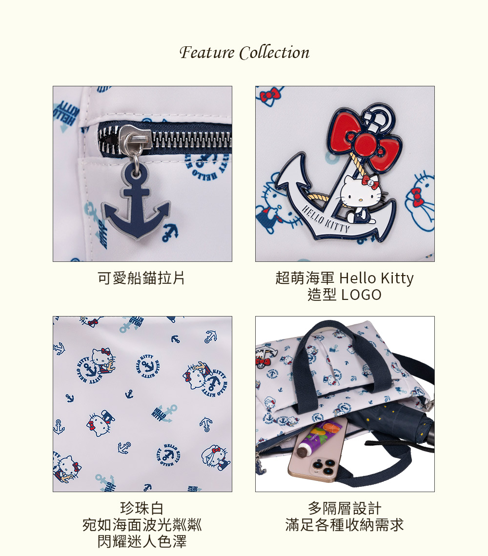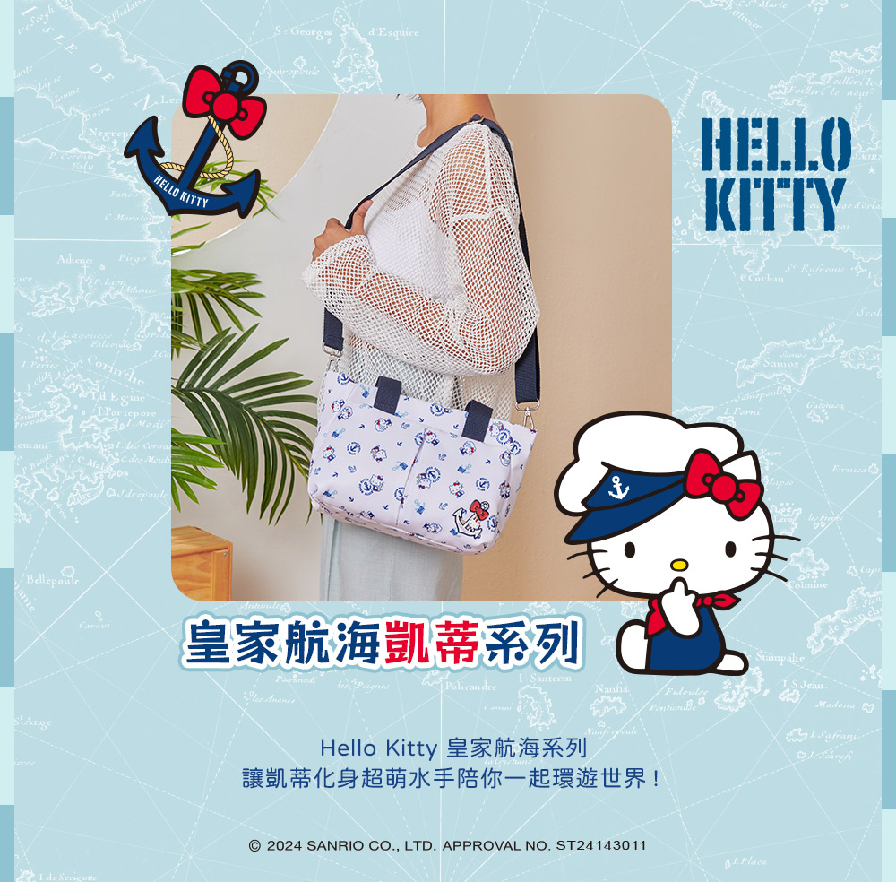 Hello Kitty 皇家航海系列,凱蒂化身超萌水手陪你一起環遊世界! 以經典海洋藍|優雅珍珠白結合海軍元素,打造各式休閒包款及旅遊配件,讓每一次出行都充滿活力!