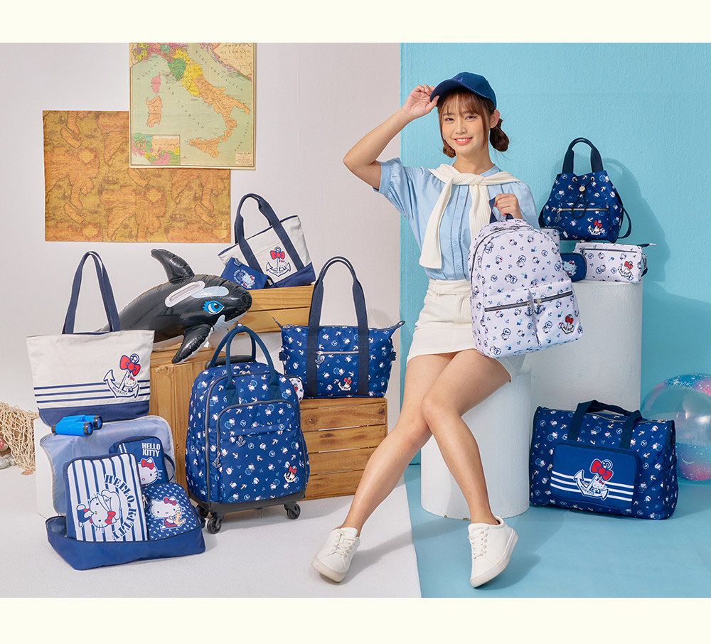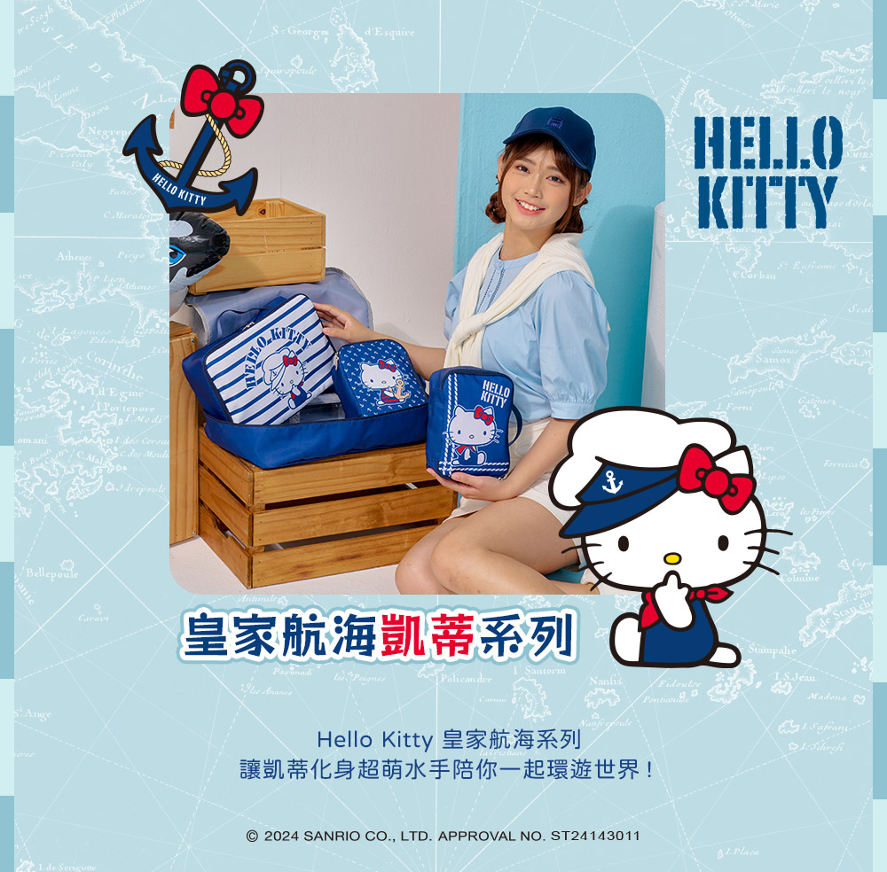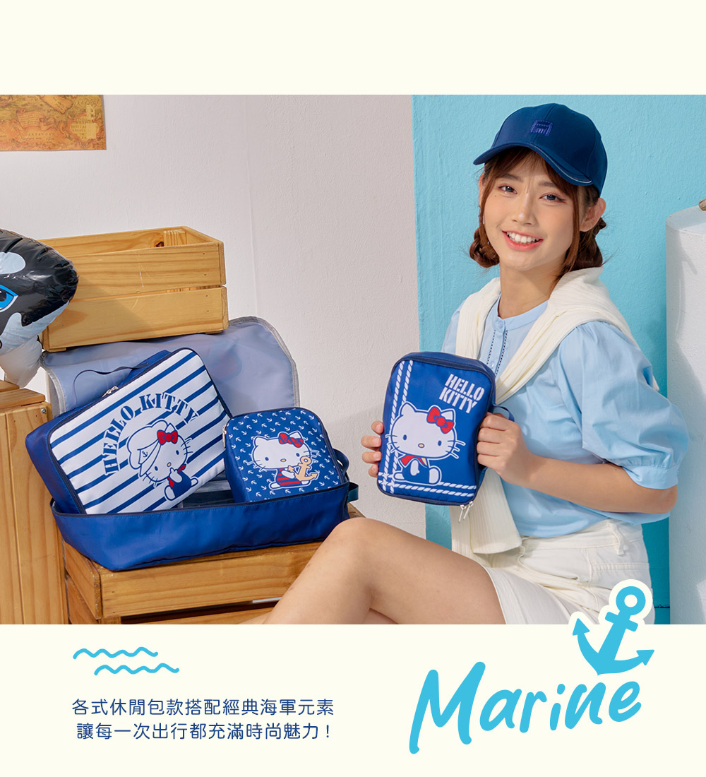 Hello Kitty 皇家航海系列,凱蒂化身超萌水手陪你一起環遊世界! 以經典海洋藍|優雅珍珠白結合海軍元素,打造各式休閒包款及旅遊配件,讓每一次出行都充滿活力!