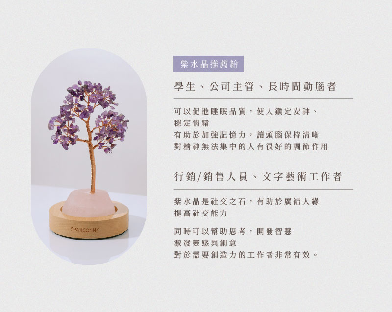 【材質規格】◦ 水晶樹材質 | 天然紫水晶、紅銅線◦ 包裝材質 | FSC環保材質美術紙◦ 水晶樹尺寸 | 約 7*17 cm◦ 燈座尺寸 | 約 9.5*2 cm◦ 禮盒尺寸 | 約 22.5*11.5*11.5 cm