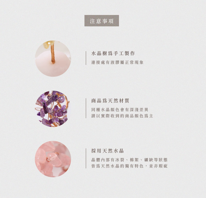 產品須知①請勿觸碰化學藥劑等。②請避免用力擺放及碰撞,以免破損。③採用天然水晶,水晶顏色會有深淺差異,且晶體內部有冰裂、棉絮、礦缺等狀態,皆為天然水晶的獨有特色,並非瑕疵。④燈座和充電線若有非人為因素發生損壞,提供30日保固。