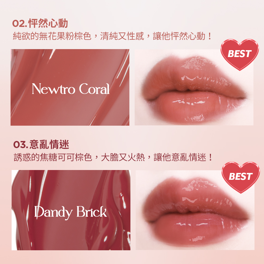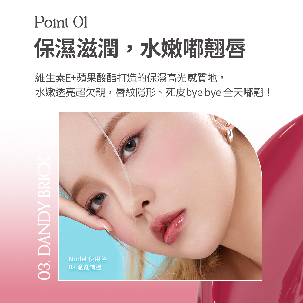 維生素E+蘋果酸酯打造的保濕高光感質地,水嫩透亮超欠親,唇紋隱形、死皮bye bye 全天嘟翹!