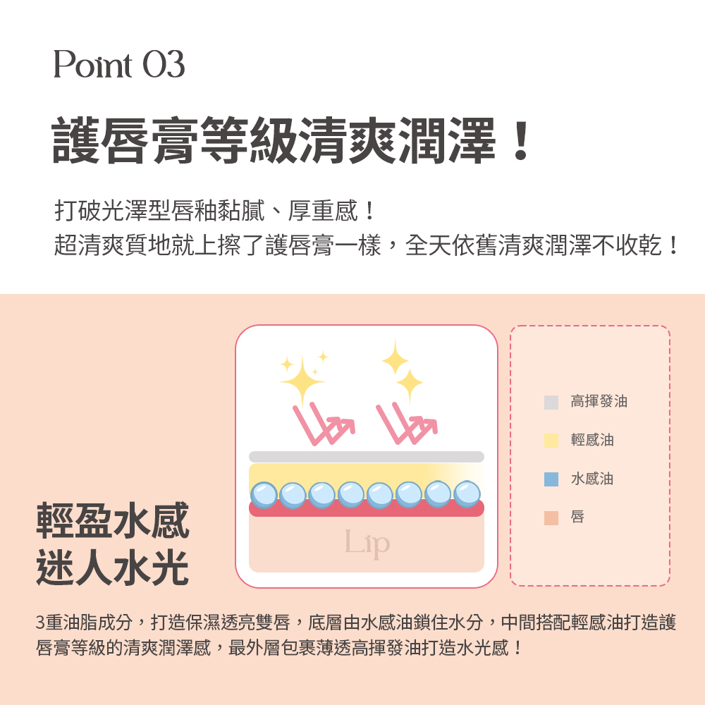 打破光澤型唇釉黏膩、厚重感! 超清爽質地就像擦了護唇膏一樣,全天清爽潤澤不收乾!