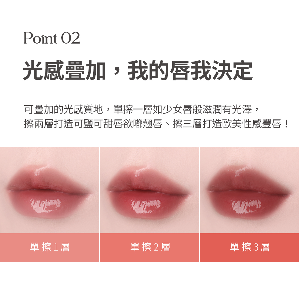 可疊家的光感質地,單擦一層如少女唇般滋潤有光澤,擦兩層打造可鹽可甜唇欲嘟翹唇、擦三層打造歐美性感豐唇!