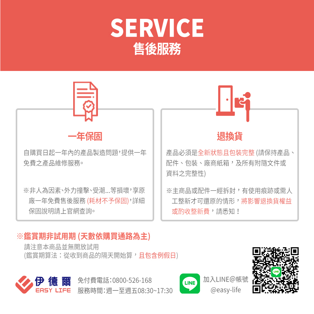 ◎鑑賞期非試用期:請注意本商品並無開放試用,主商品或配件一經試用將影響您退貨權益,但依照消費者保護法規定,消費者均享有產品到貨鑑賞猶豫期之權益。
