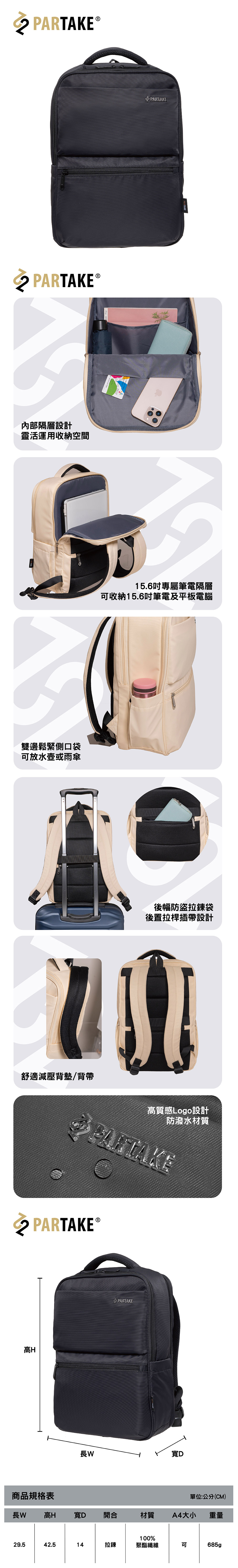 商品特色- 霧面金屬質感LOGO- 15.6吋專屬筆電隔層,可收納15.6吋筆電及平板電腦,靈活運用收納空間- 後置拉桿插帶設計 & 防盜拉鍊袋設計- 兩側收納設計 & 防潑水材質- 透氣背墊設計,舒適度大幅提升