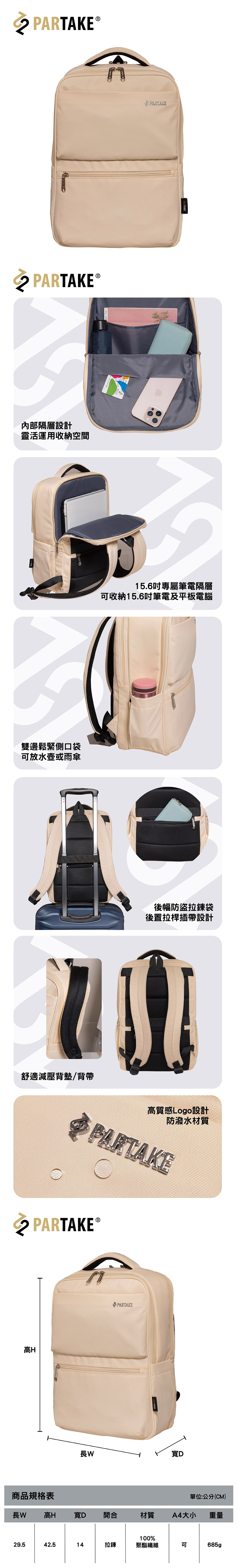 商品特色- 霧面金屬質感LOGO- 15.6吋專屬筆電隔層,可收納15.6吋筆電及平板電腦,靈活運用收納空間- 後置拉桿插帶設計 & 防盜拉鍊袋設計- 兩側收納設計 & 防潑水材質- 透氣背墊設計,舒適度大幅提升