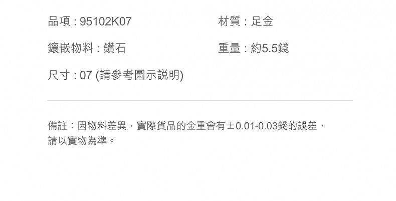【商家資訊】公司名:英屬維爾京群島商周生生珠寶行股份有限公司台灣分公司統一編號:89390142客服電話:02-2789-6809客服時段:週一~週五10:00~17:00