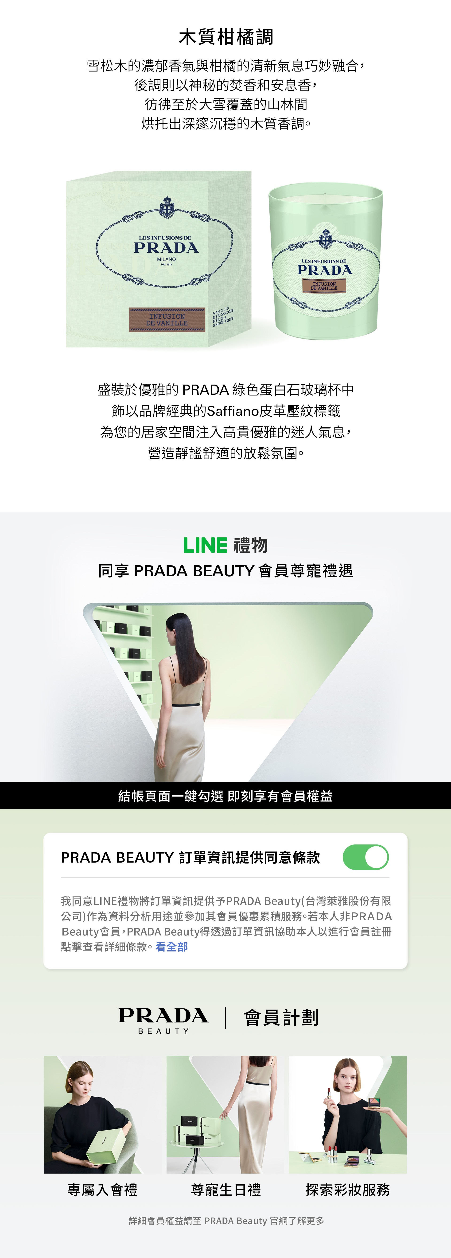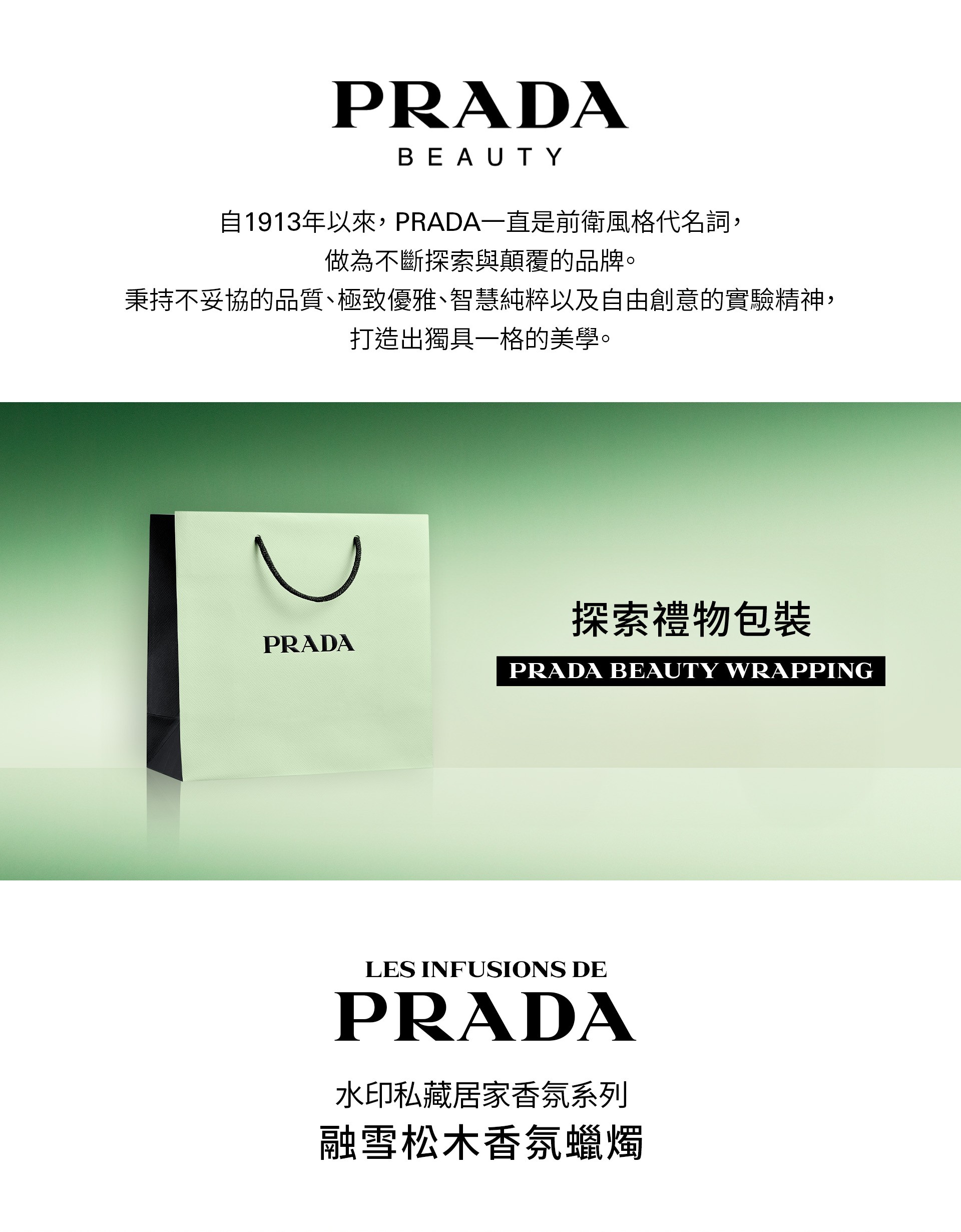 融雪松木香氛蠟燭,以木質柑橘調香氣,展現雪松木的迷人氣息。香氛蠟燭探索雪松木的全新面向,將其濃郁香氣與柑橘的清新氣息巧妙融合,碰撞出令人驚喜的嗅覺火花。後調則以神秘的焚香和安息香,烘托出深邃沉穩的木質香調。香氛蠟燭盛裝於優雅的 PRADA 綠色蛋白石玻璃杯中,並飾以品牌經典的Saffiano皮革壓紋標籤和歷史悠久的標誌,體現 PRADA 的精緻美學。這款奢華的香氛蠟燭,為您的居家空間注入沉靜內斂的獨特風格,營造溫暖舒適的放鬆氛圍。