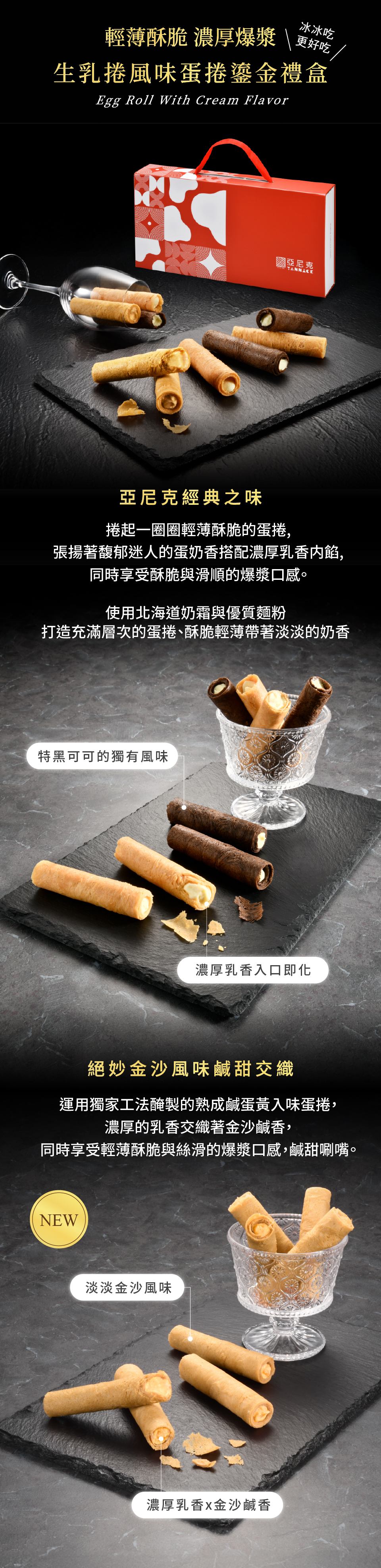 運用獨家工法醃製的熟成鹹蛋黃入味蛋捲,濃厚的乳香交織著金沙鹹香,同時享受輕薄酥脆與絲滑的爆漿口感,鹹甜涮嘴。