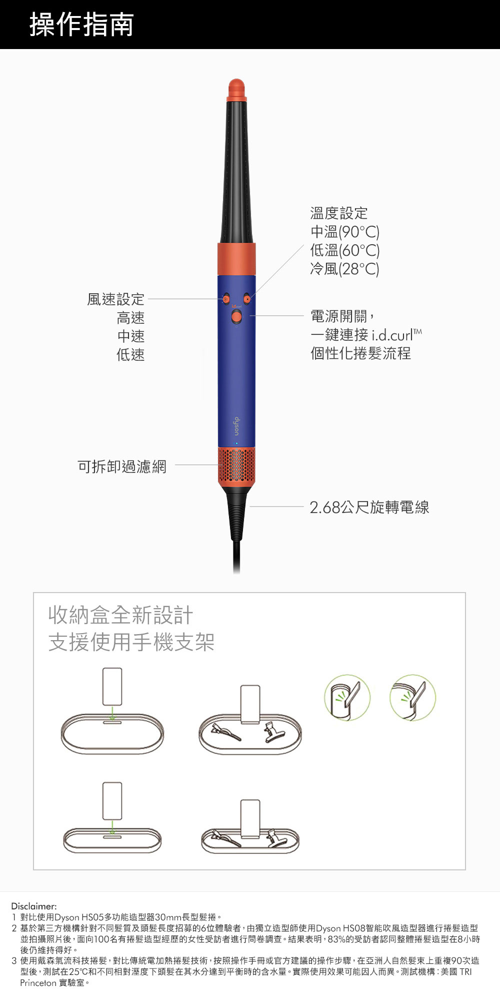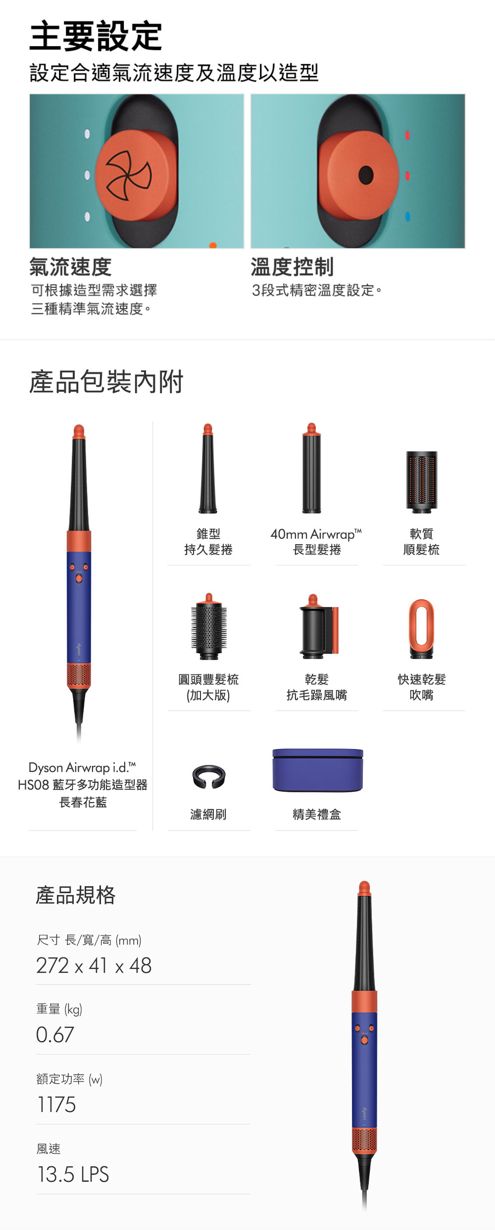 品牌:Dyson品牌國別:英國品名:Dyson Airwrap i.d. HS08 藍牙多功能造型器型號:Dyson HS08顏色:長春花藍國際條碼:5025155099292製造國:馬來西亞商品尺寸(mm):272 x 48 x 41mm (HxWxD) 包裝尺寸(mm):175 x 198 x 399 mm (HxWxD) 商品淨重(g):670g商品毛重(kg):3.6kg電壓:110v額定功率(W):1175w風量設置:3段式-高速風量, 中速風量, 低速風量 溫度設置:3段式-中溫(90◦C)、低溫(60◦C) 、冷風鍵(28◦C) 瞬間冷風:開關鍵往上長推即為冷風鍵 機身上有個藍色標示 電線長度:2.68公尺保固:機器與電線保固兩年負離子:有助減少頭髮產生的靜電LED濾網清潔提示燈:有。當異物堵塞時,燈號將會提示(燈號顯示於機身LOGO下方)磁吸式濾網:磁吸式設計拆解方便,可水洗,並附濾網清潔刷。360度旋轉式電線:電線易於移動,任何角度均可方便使用收納盒:配有收納盒方便保護Dyson Airwrap多功能造型器與配件。要使用 MyDyson應用程式APP,您需要先連接有效的網路。目前作業系統相容,但無法完全保證。行動裝置必須支援 Bluetooth®無線科技4.0(藍牙低功耗),才能與您的機器建立連線。檢查您的裝置規格相容性。配件:快速乾髮吹嘴、圓頭豐髮梳(加大版)、乾髮抗毛躁風嘴、軟質順髮梳、錐形持久髮捲、40mm Airwrap長型髮捲、濾網刷、禮盒快速乾髮吹嘴Fast dryer:使用髮捲、造型前,快速吹乾頭髮,將全濕頭髮吹到全乾或微濕。圓頭豐髮梳(加大版):打造內彎髮型,亦可輕鬆打造豐盈感、蓬鬆髮根及塑型高顱頂。乾髮抗毛躁風嘴:雙重功能-吹乾頭髮並隱藏毛躁。軟質順髮梳:輕鬆打造順滑直髮。亦可捲髮造型後打理,更顯順滑自然。錐形持久髮捲:造型更易貼近髮根,打造漸進捲度,令造型更自然持久。40mm Airwrap長型髮捲:經典長款捲筒,做出更富有空氣感的捲髮造型。禮盒:收納盒新設計支援使用手機支架