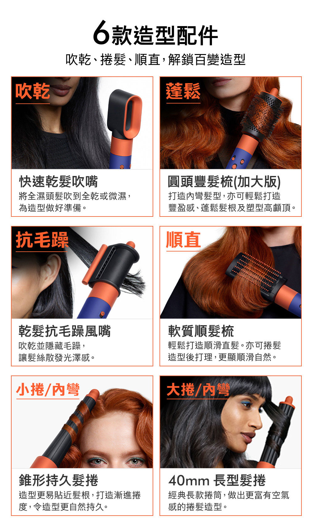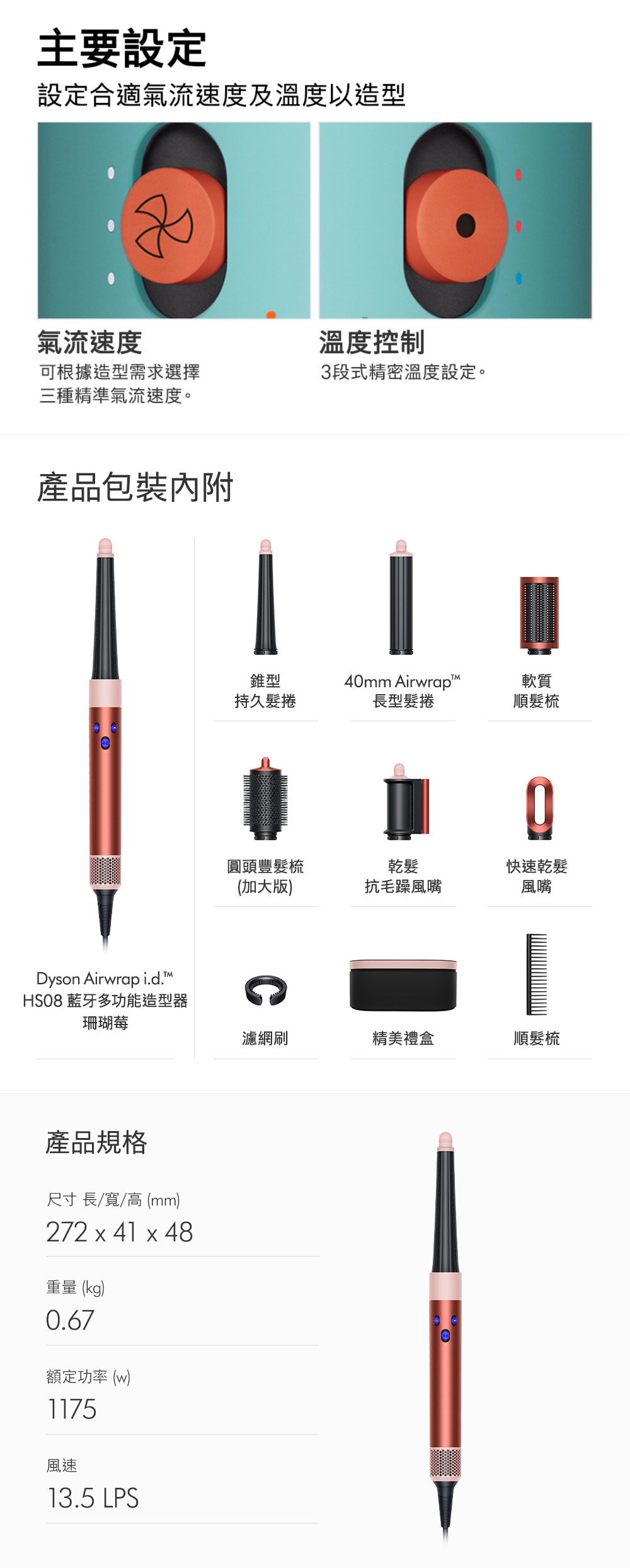 品牌:Dyson品牌國別:英國品名:Dyson Airwrap i.d. HS08 藍牙多功能造型器型號:Dyson HS08顏色:珊瑚莓國際條碼:5025155103562製造國:馬來西亞商品尺寸(mm):272 x 48 x 41mm (HxWxD) 包裝尺寸(mm):180 x 200 x 400 mm (HxWxD) 商品淨重(g):670g商品毛重(kg):3.6kg電壓:110v額定功率(W):1175w風量設置:3段式-高速風量, 中速風量, 低速風量 溫度設置:3段式-中溫(90◦C)、低溫(60◦C) 、冷風鍵(28◦C) 瞬間冷風:開關鍵往上長推即為冷風鍵 機身上有個藍色標示 電線長度:2.68公尺保固:機器與電線保固兩年負離子:有助減少頭髮產生的靜電LED濾網清潔提示燈:有。當異物堵塞時,燈號將會提示(燈號顯示於機身LOGO下方)磁吸式濾網:磁吸式設計拆解方便,可水洗,並附濾網清潔刷。360度旋轉式電線:電線易於移動,任何角度均可方便使用收納盒:配有收納盒方便保護Dyson Airwrap多功能造型器與配件。要使用 MyDyson應用程式APP,您需要先連接有效的網路。目前作業系統相容,但無法完全保證。行動裝置必須支援 Bluetooth®無線科技4.0(藍牙低功耗),才能與您的機器建立連線。檢查您的裝置規格相容性。配件:快速乾髮吹嘴、圓頭豐髮梳(加大版)、乾髮抗毛躁風嘴、軟質順髮梳、錐形持久髮捲、40mm Airwrap長型髮捲、順髮梳、濾網刷、禮盒快速乾髮吹嘴Fast dryer:使用髮捲、造型前,快速吹乾頭髮,將全濕頭髮吹到全乾或微濕。圓頭豐髮梳(加大版):打造內彎髮型,亦可輕鬆打造豐盈感、蓬鬆髮根及塑型高顱頂。乾髮抗毛躁風嘴:雙重功能-吹乾頭髮並隱藏毛躁。軟質順髮梳:輕鬆打造順滑直髮。亦可捲髮造型後打理,更顯順滑自然。錐形持久髮捲:造型更易貼近髮根,打造漸進捲度,令造型更自然持久。40mm Airwrap長型髮捲:經典長款捲筒,做出更富有空氣感的捲髮造型。