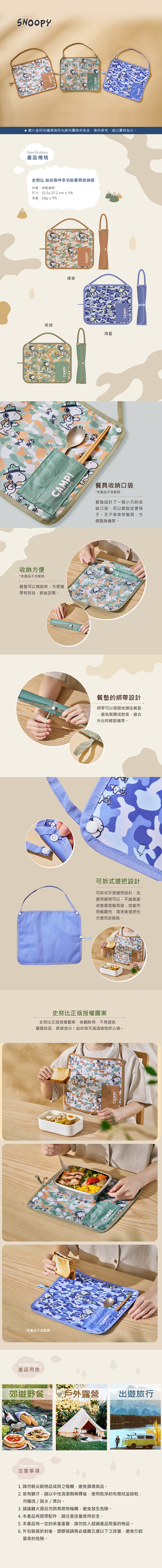 品 名:史努比 迷彩森林多功能餐具收納袋(草綠/裸麥/海藍,三色可選擇)