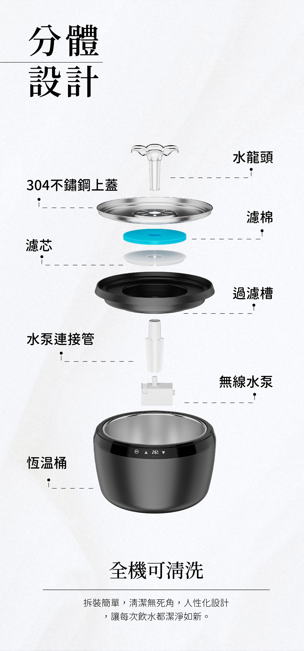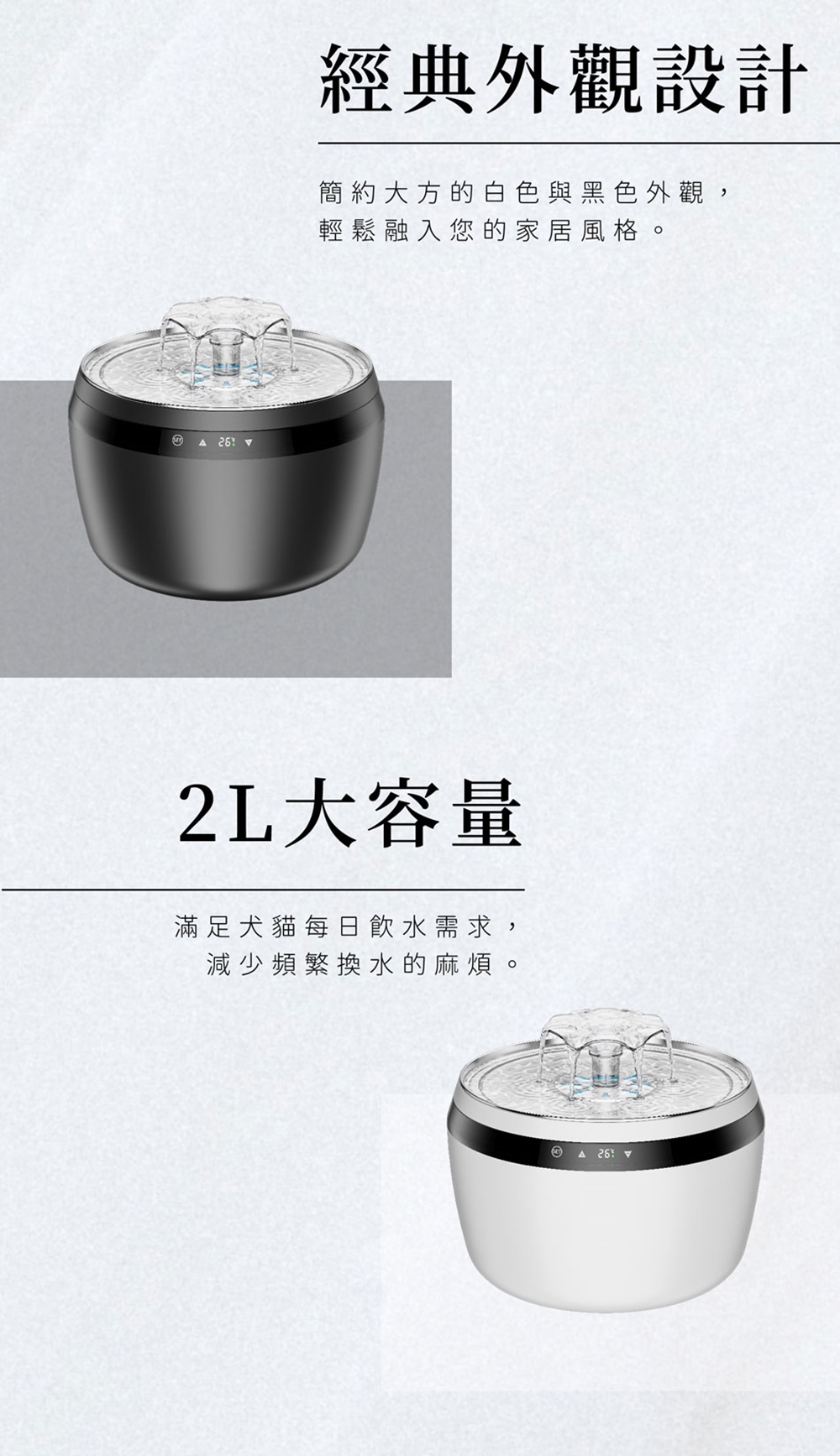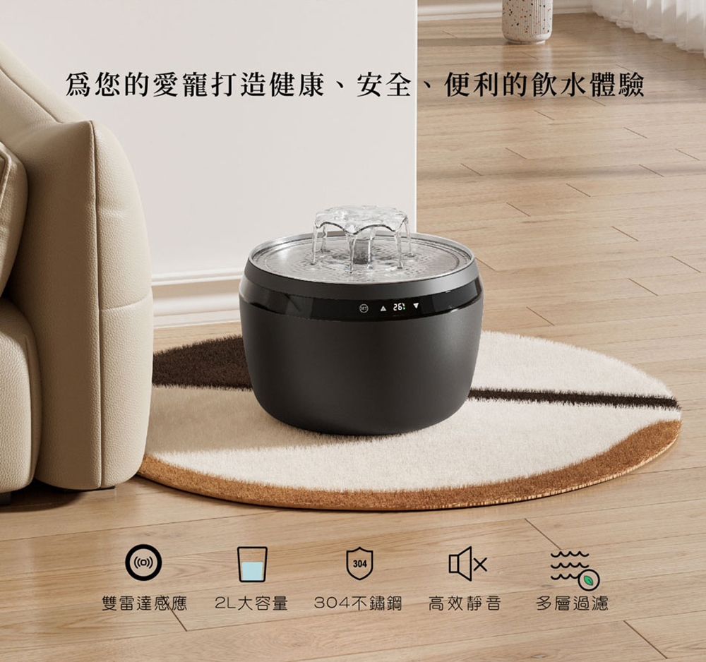 ※雙雷達感應啟動出水,更省電※數位顯示控溫活水,可恆溫至40℃※低壓直流電,高安全性※高效靜音水泵,自帶殺菌燈功能,讓飲水更加健康