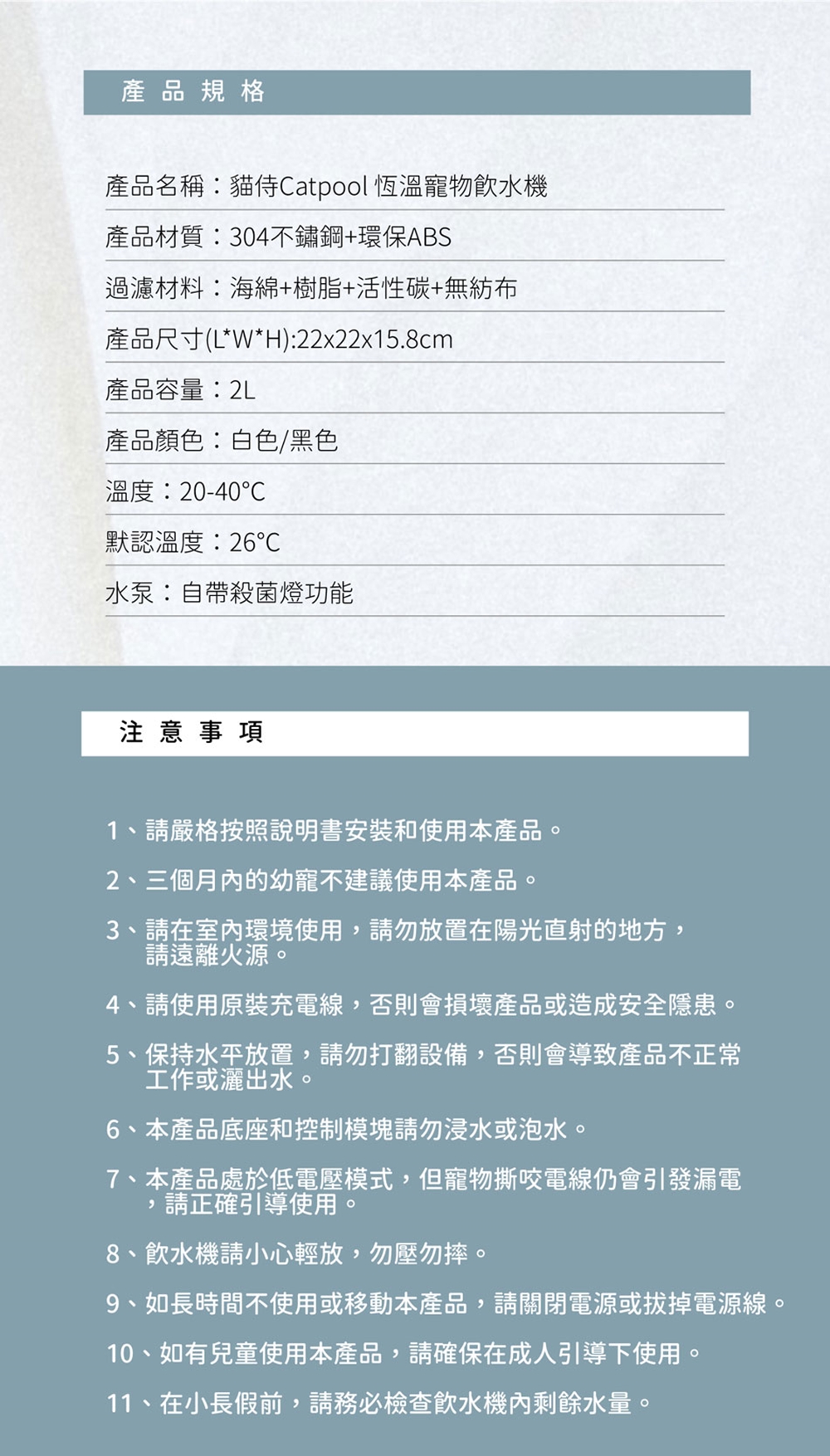 ------------------------------------------------------------------------------------------------------------產品名稱:貓侍Catpool 恆溫寵物飲水機產品型號:WF320產品材質:304不鏽鋼+環保ABS過濾材料:海綿+樹脂+活性碳+無紡布產品尺寸(L*W*H):22x22x15.8cm產品容量:2L產品重量:1300g產品顏色:白色/黑色溫度:20-40℃默認溫度:26℃水泵:自帶殺菌燈功能輸入電壓:100-240V,60Hz 1.2A輸出電壓:12V=4000mA產地:中國適用對象:寵物(犬貓)使用更換建議:每兩週更換一次濾芯