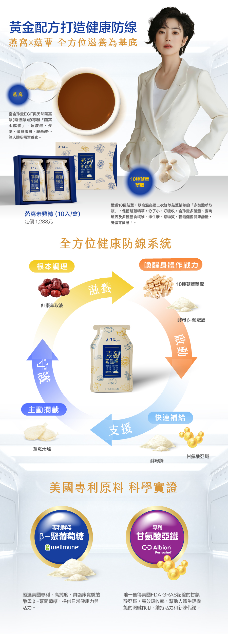 ・內容物:多醣體萃取液(水、杏鮑菇、金針菇、秀珍菇、珊瑚菇、雪白菇、香菇、舞菇、黑木耳、白木耳、雪耳) 、紅棗萃取液(水、紅棗) 、β-聚葡萄糖、柑橘纖維、燕窩水解物(麥芽糊精、燕窩水解物) 、鋅酵母(啤酒酵母、硫酸鋅) 、甘氨酸亞鐵(甘氨酸亞鐵、檸檬酸、麥芽糊精、二氧化矽)。