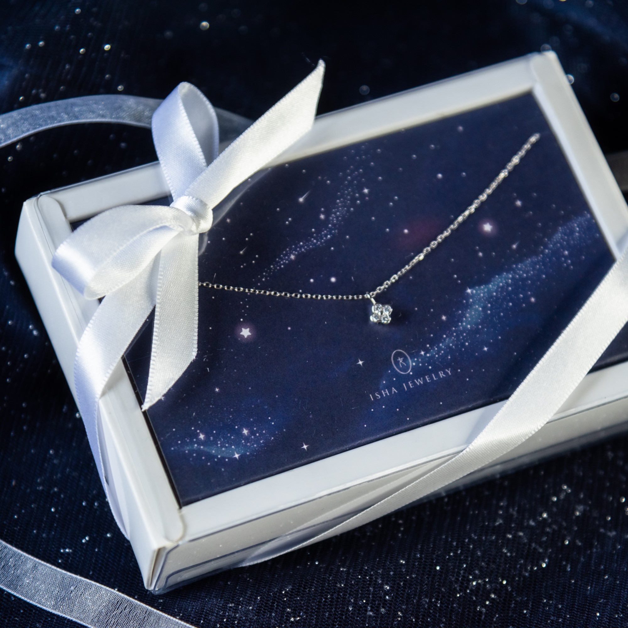 「我們的相遇,就像兩顆星星相逢一般,如此幸運,又如此耀眼」:Isha Jewelry精心準備星空感禮盒,搭配相傳每 5000 株才會遇見一株、代表幸運的小四葉草鋯鑽項鍊,紀念彼此的感情,不論是愛情、友情或是親情,都如同在銀河中的兩顆星一樣,閃爍耀眼又浪漫美好。