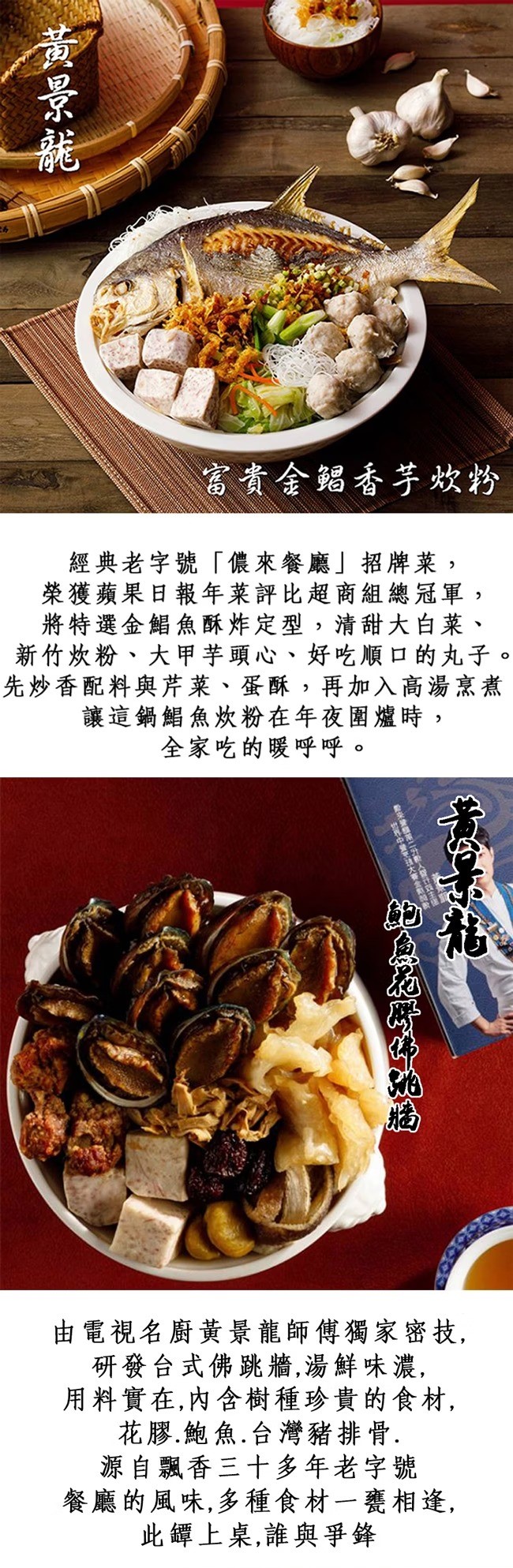 1.商品組合/規格:【黃景龍 x 儂來餐廳】人氣熱銷兩件組(金鯧香芋炊粉+鮑魚花膠佛跳牆)2.商品品名:【黃景龍 x 儂來餐廳】人氣熱銷兩件組(金鯧香芋炊粉+鮑魚花膠佛跳牆)3.商品重(容)量: