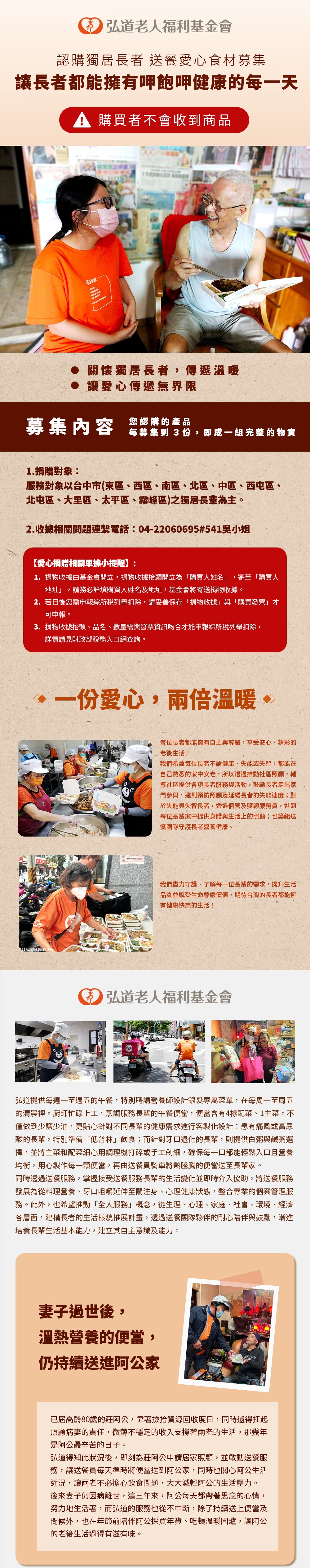 商品介紹*每募集到4份,即成一組完整的物資*購買者不會收到商品*關懷獨老,傳遞溫暖*讓愛心傳遞無界限*勸募字號:衛部救字第1141364342號