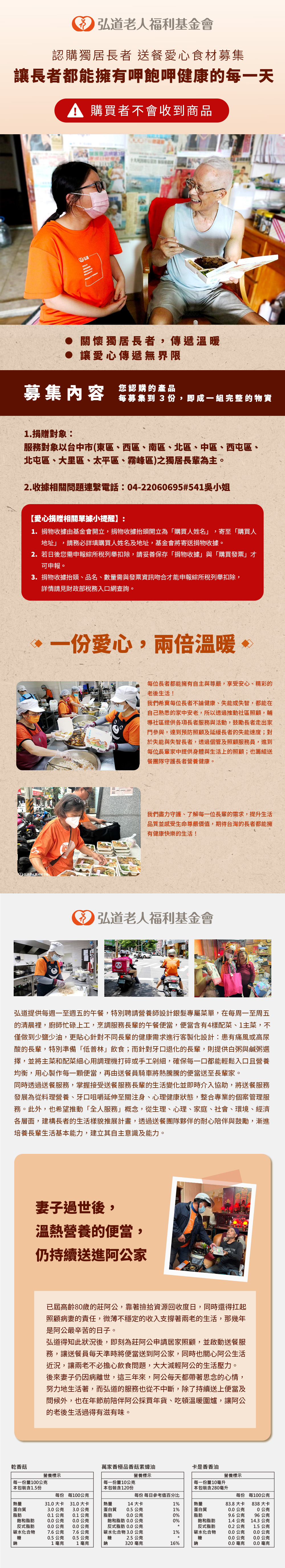 商品介紹*每募集到3份,即成一組完整的物資*購買者不會收到商品*關懷獨老,傳遞溫暖*讓愛心傳遞無界限*勸募字號:衛部救字第1131363520號
