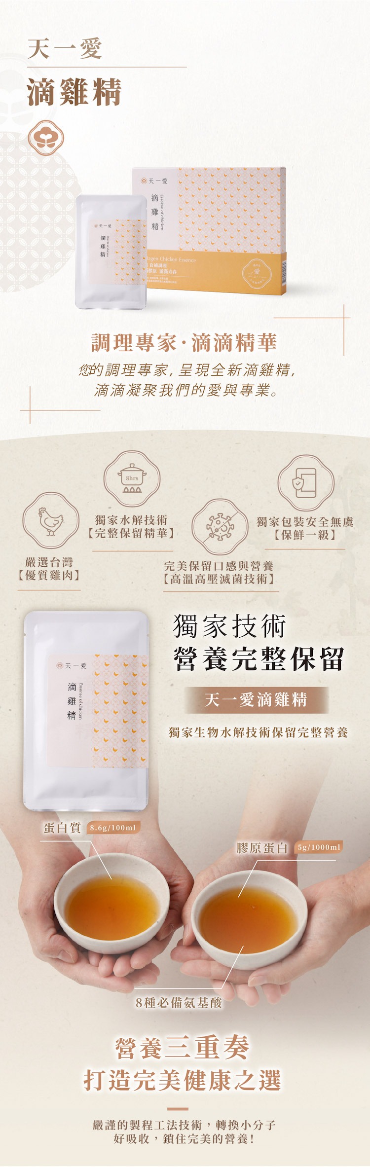 ★女性漢方調理品牌NO.1滴雞精,一盒8包▲膠原滿滿,額外添加黑羽土雞雞爪膠原10g,美麗加分▲滴滴精華,8種人體必備氨基酸▲獨家生物水解技術,營養完整保留▲嚴謹製程工法,轉換小分子好吸收▲嚴選台灣優質雞肉,好喝新鮮香醇▲每包僅17大卡,健康低脂無負擔▲經高溫高壓殺菌可常溫保存,絕無防腐劑▲適合送禮或無法冷凍時的選購