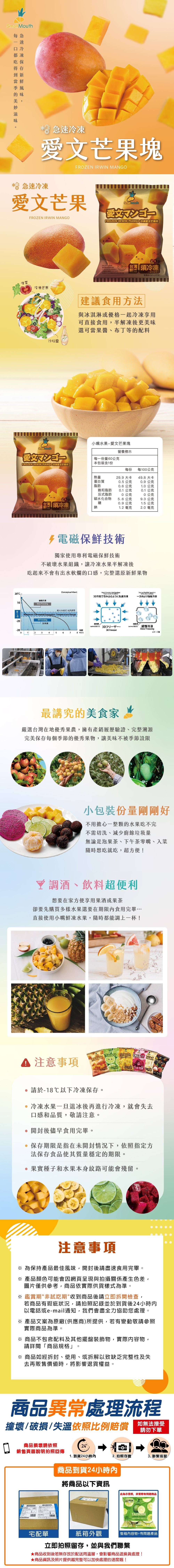 商品內容商品組合/規格:60g/包x5包商品品名:急速冷凍愛文芒果塊商品重(容)量:60g/包x5包內容物成分(如含有豬、牛成分請加註國別):新鮮愛文芒果100%食品添加物名稱:無原產地(國):台灣保存期限:18個月保存方式:冷凍-18℃保存,開封後請盡早食用完畢。冷凍水果一旦退冰後再進行冷凍就會失去口感和品質,敬請注意。食用方式:開封即食,可參考文案中多樣食用方式。