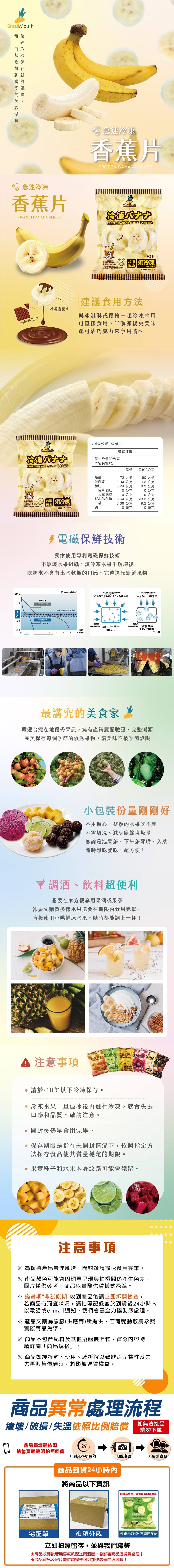 商品內容商品組合/規格:80g/包x5包商品品名:急速冷凍香蕉片商品重(容)量:80g/包x5包內容物成分(如含有豬、牛成分請加註國別):新鮮香蕉100%食品添加物名稱:無原產地(國):台灣保存期限:18個月保存方式:冷凍-18℃保存,開封後請盡早食用完畢。冷凍水果一旦退冰後再進行冷凍就會失去口感和品質,敬請注意。食用方式:開封即食,可參考文案中多樣食用方式。