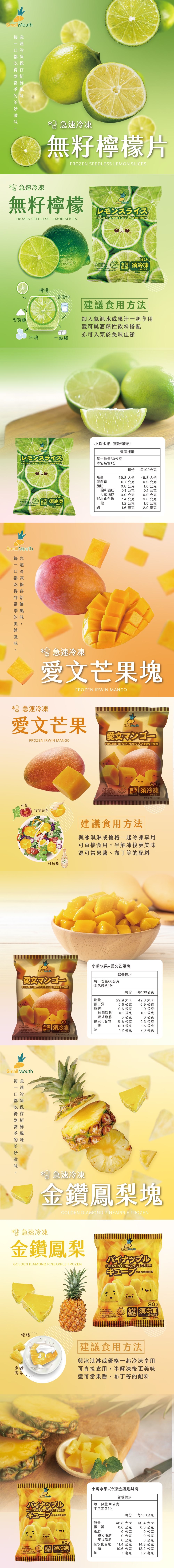 商品內容商品組合/規格:冷凍無籽檸檬片80g/包x3包+冷凍愛文芒果塊60g/包x1包+冷凍金鑽鳳梨塊80g/包x1包商品品名:急速冷凍方便調飲小包組商品重(容)量:冷凍無籽檸檬片80g/包x3包+冷凍愛文芒果塊60g/包x1包+冷凍金鑽鳳梨塊80g/包x1包,共380g/組內容物成分(如含有豬、牛成分請加註國別):無籽檸檬100%、新鮮愛文芒果100%、金鑽鳳梨100%食品添加物名稱:無原產地(國):台灣保存期限:18個月保存方式:冷凍-18℃保存,開封後請盡早食用完畢。冷凍水果一旦退冰後再進行冷凍就會失去口感和品質,敬請注意。食用方式:開封即食,可參考文案中多樣食用方式。