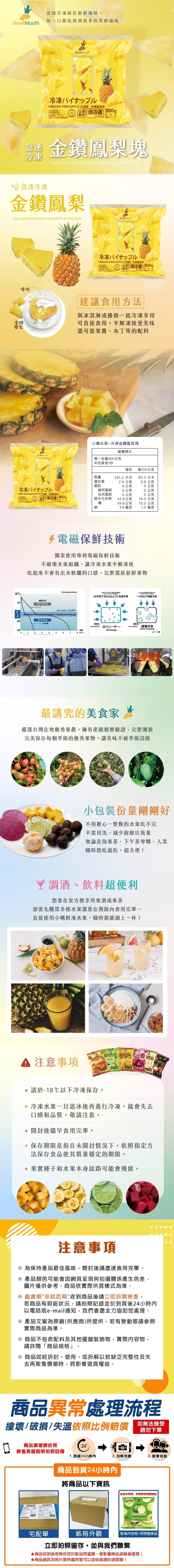 商品內容商品組合/規格:300g/包x2包商品品名:急速冷凍鳳梨塊商品重(容)量:300g/包x2包內容物成分(如含有豬、牛成分請加註國別):新鮮金鑽鳳梨100%食品添加物名稱:無原產地(國):台灣保存期限:18個月保存方式:冷凍-18℃保存,開封後請盡早食用完畢。冷凍水果一旦退冰後再進行冷凍就會失去口感和品質,敬請注意。食用方式:開封即食,可參考文案中多樣食用方式。