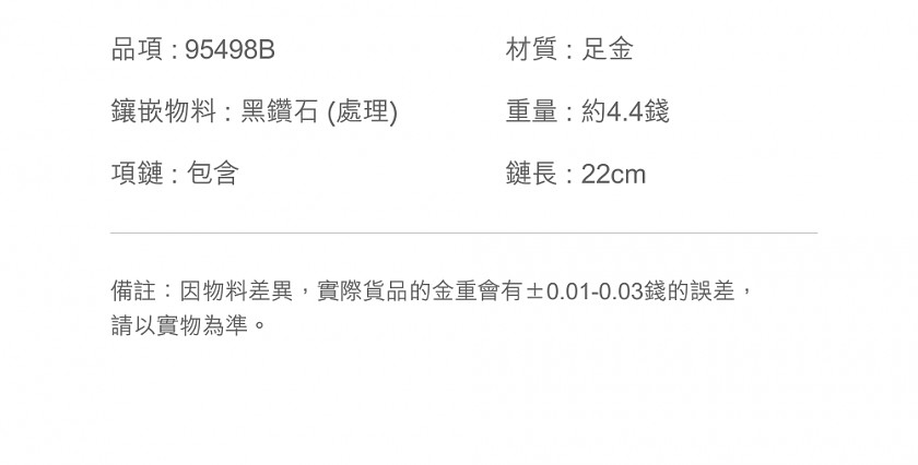 【商家資訊】公司名:英屬維爾京群島商周生生珠寶行股份有限公司台灣分公司統一編號:89390142客服電話:02-2789-6809客服時段:週一~週五10:00~17:00
