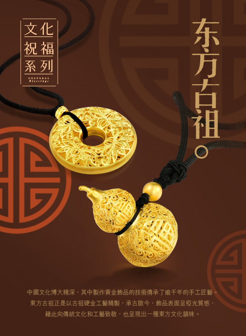 以「四合如意」為設計元素,採古祖黃金工藝,美鑽相映點綴,勾勒精緻華美的四瓣花絲圖案,