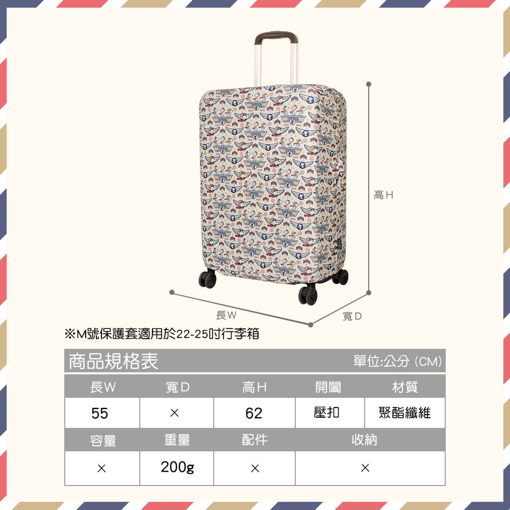 商品特色- 滿版圖騰增添行李箱的辨識度- 尺寸適用於22-25吋行李箱- 超輕量聚酯纖維材質,耐磨耐刮耐用度高