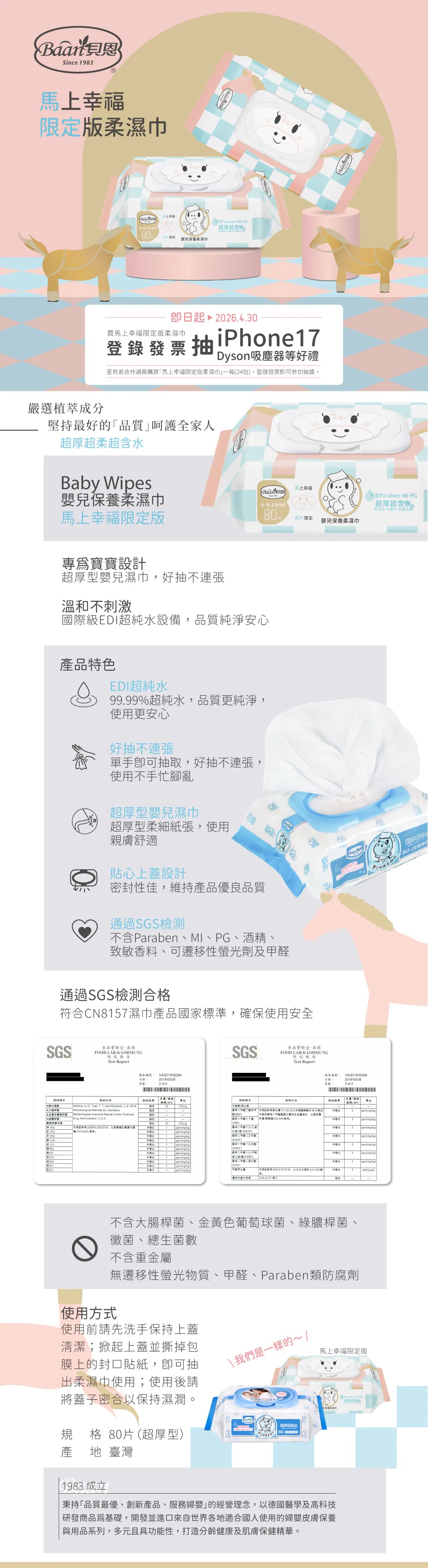 品號 1570030200022品名 台灣 Baan 貝恩 限定版馬上幸福嬰兒保養柔濕巾(80抽/24入)【公司宅配】【安琪兒婦嬰百貨】