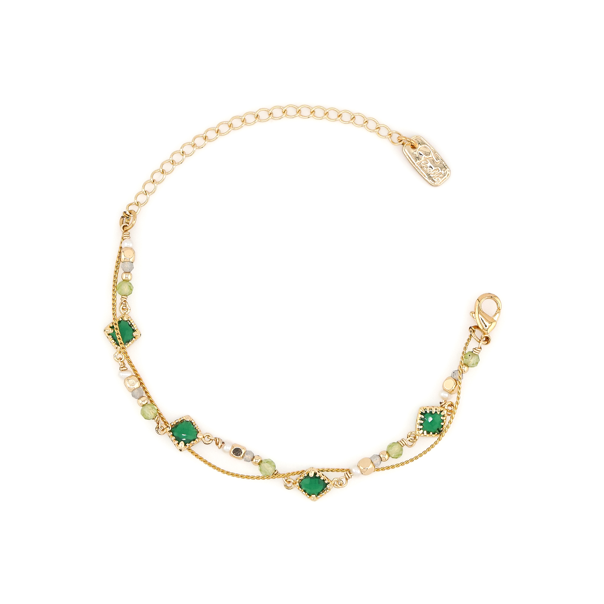 橄欖石、拉長石、淡水珍珠、水晶琉璃、黃銅鍍18K金