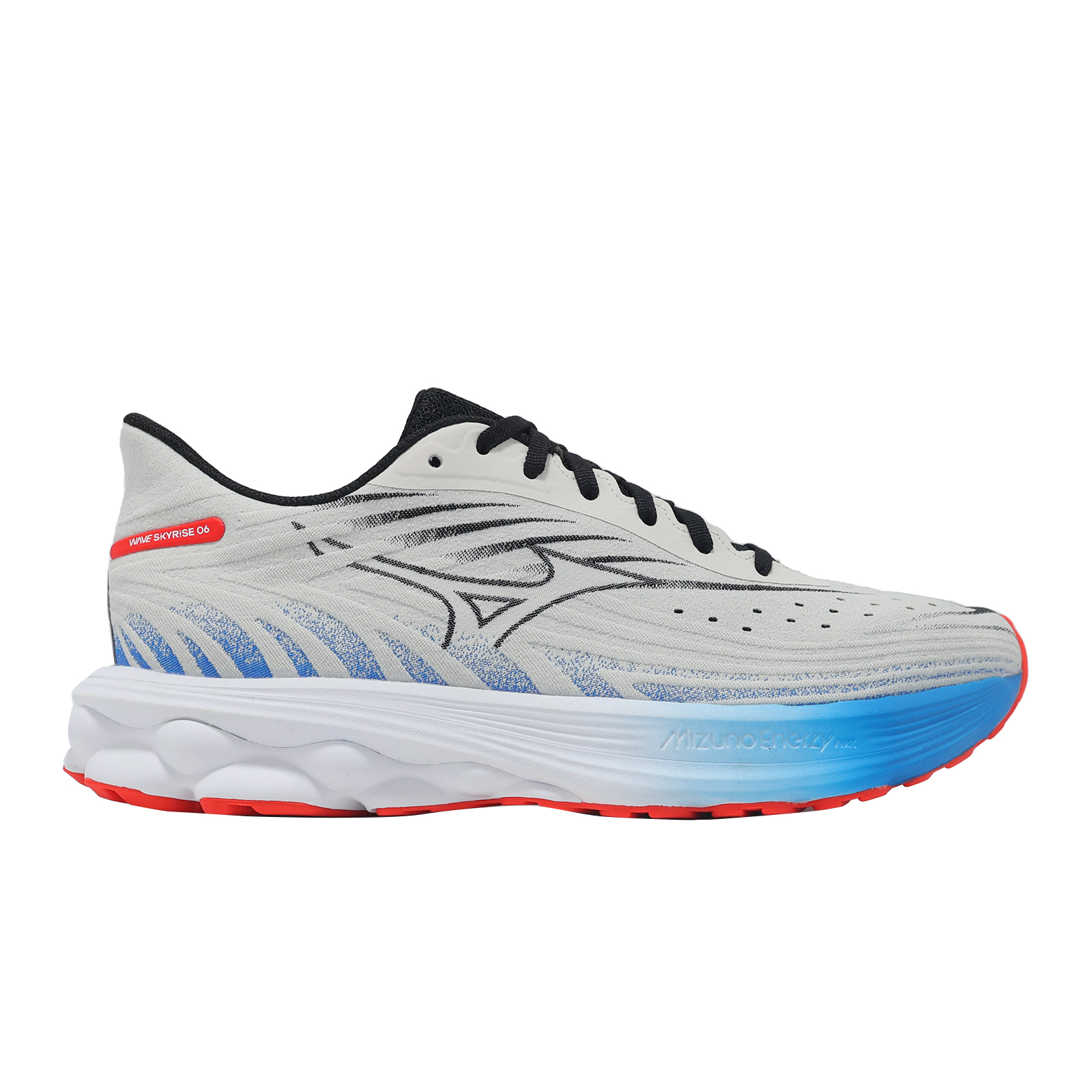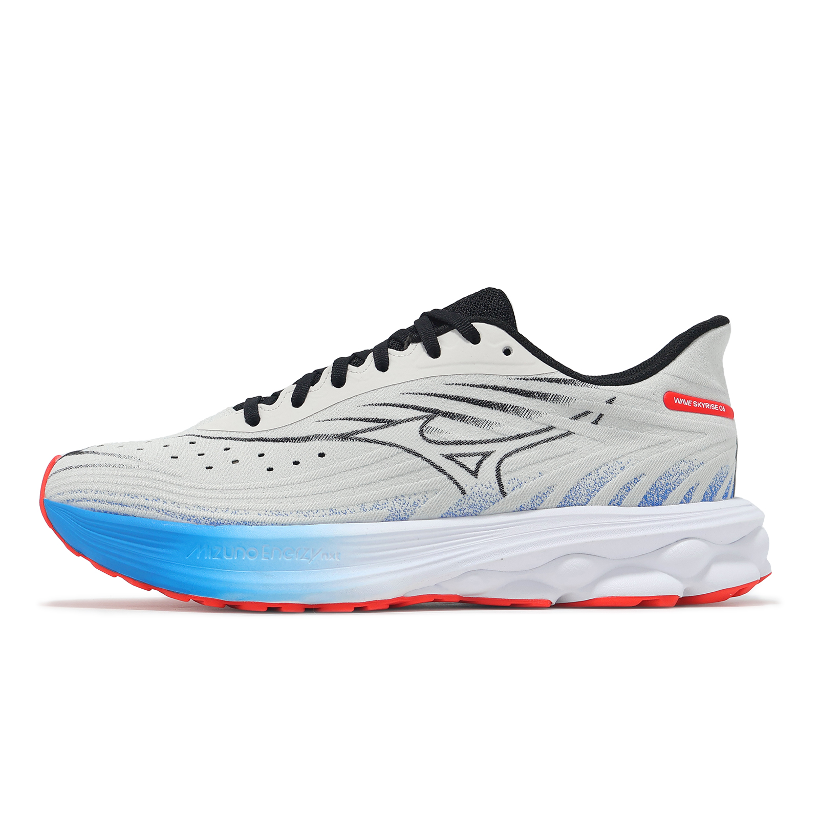 品牌: MIZUNO型號: J1GC2509-06品名: Wave Skyrise 6版型: 版型正常* 鞋面採用一片式 SMOOTH STRETCH WOVEN 平織網布構成,提供雙足穩定包覆感,鞋頭較前一代增加更多透氣孔,透氣效果提升。