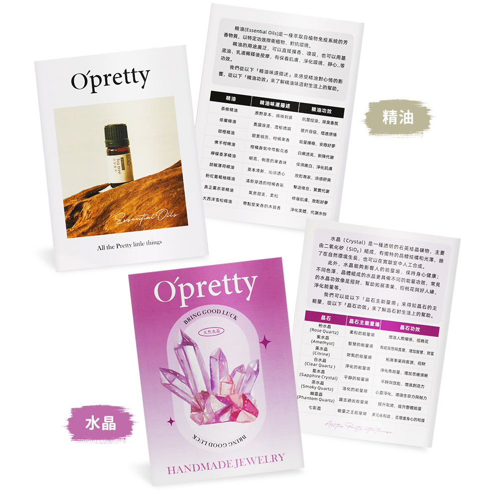 【商品規格】 內容物:1.O'Pretty 歐沛媞 天然晶石2.O'Pretty 歐沛媞 木質底座3.O'Pretty 歐沛媞 天然草本精油4.O'Pretty 歐沛媞 水晶能量直覺卡5.O'Pretty 歐沛媞 精油療癒直覺卡)材質:天然晶石+木頭+精油等包材