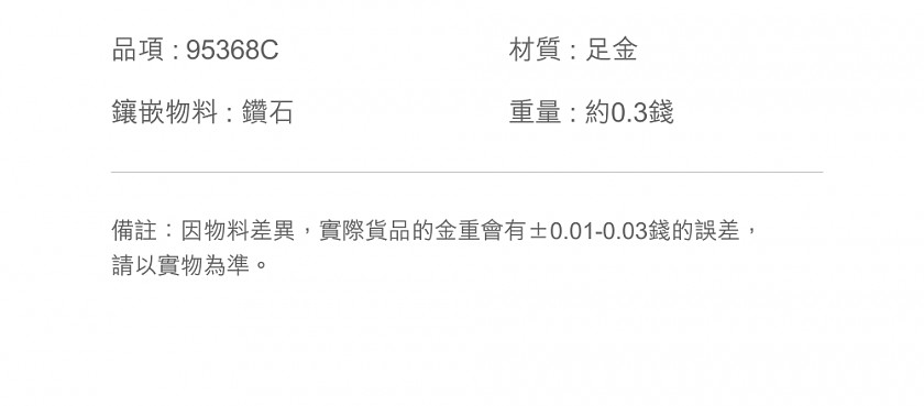 【商家資訊】公司名:英屬維爾京群島商周生生珠寶行股份有限公司台灣分公司統一編號:89390142客服電話:02-2789-6809客服時段:週一~週五10:00~17:00