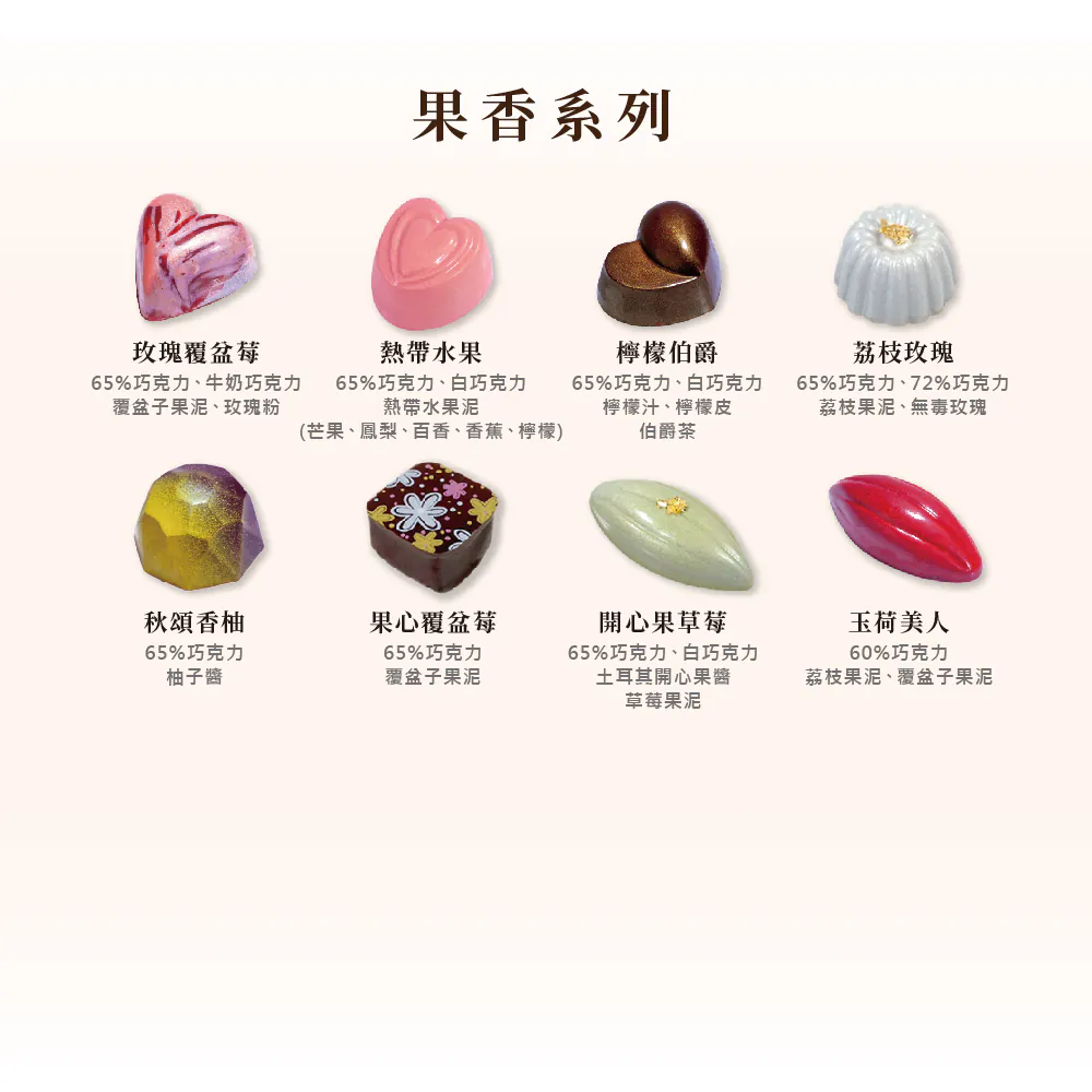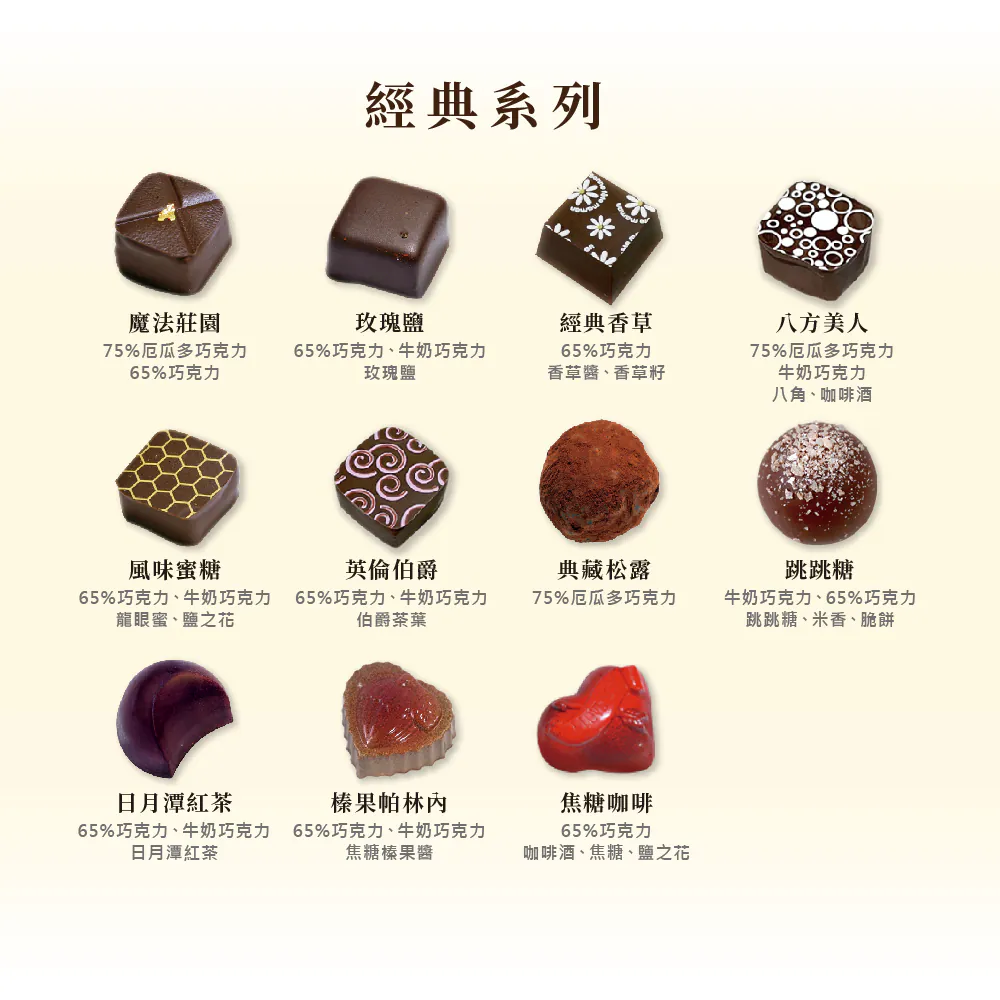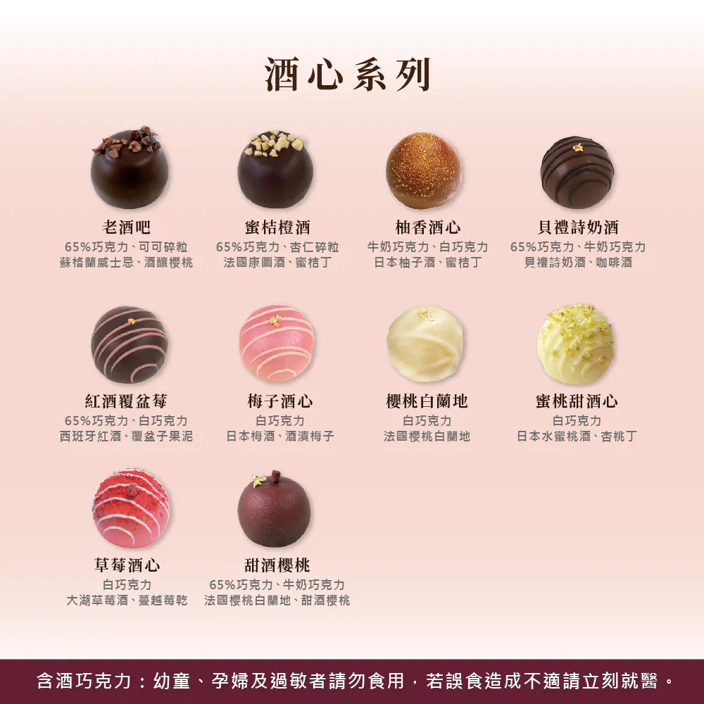| 商品資訊 | 蛋奶素(酒類除外) 主成份為嚴選進口調溫巧克力、奶油、動物性鮮奶油 酒心系列:紅酒覆盆莓、櫻桃白蘭地、甜酒櫻桃為固態內餡,其餘為液態 內容量:共10顆,每顆約35g | 保存方法 | 賞味期限:收到商品後7日 保存方法:冷藏 製造 / 有效日期:標示於包裝上 | 食用方法 | 冷藏取出後於室內回溫3~5分鐘 即為最佳品嚐口感